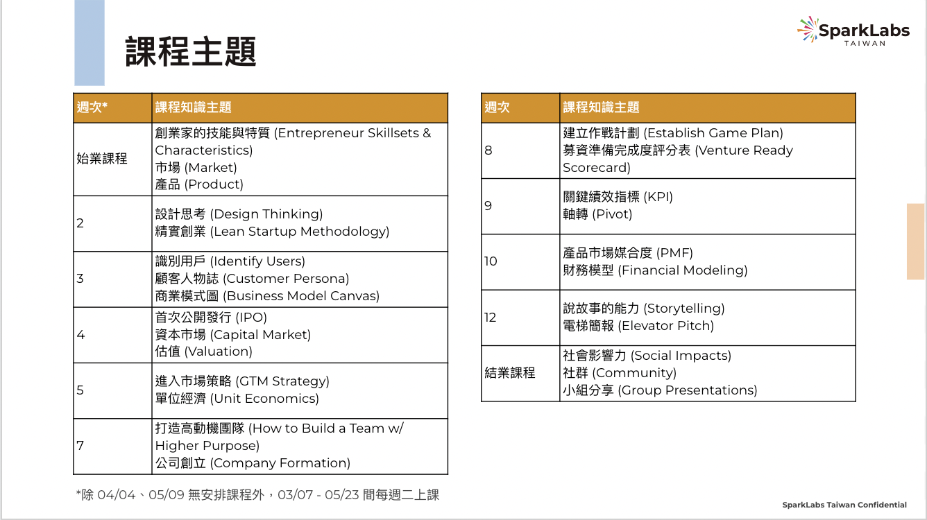 過往只在美國教學的 Terry 首度回台灣親自以中文授課,與 SparkLabs Taiwan 精心安排十二堂精選課程及創業提案演練!想了解更多講師 Terry 的經歷,歡迎參考完整創業經歷訪談。