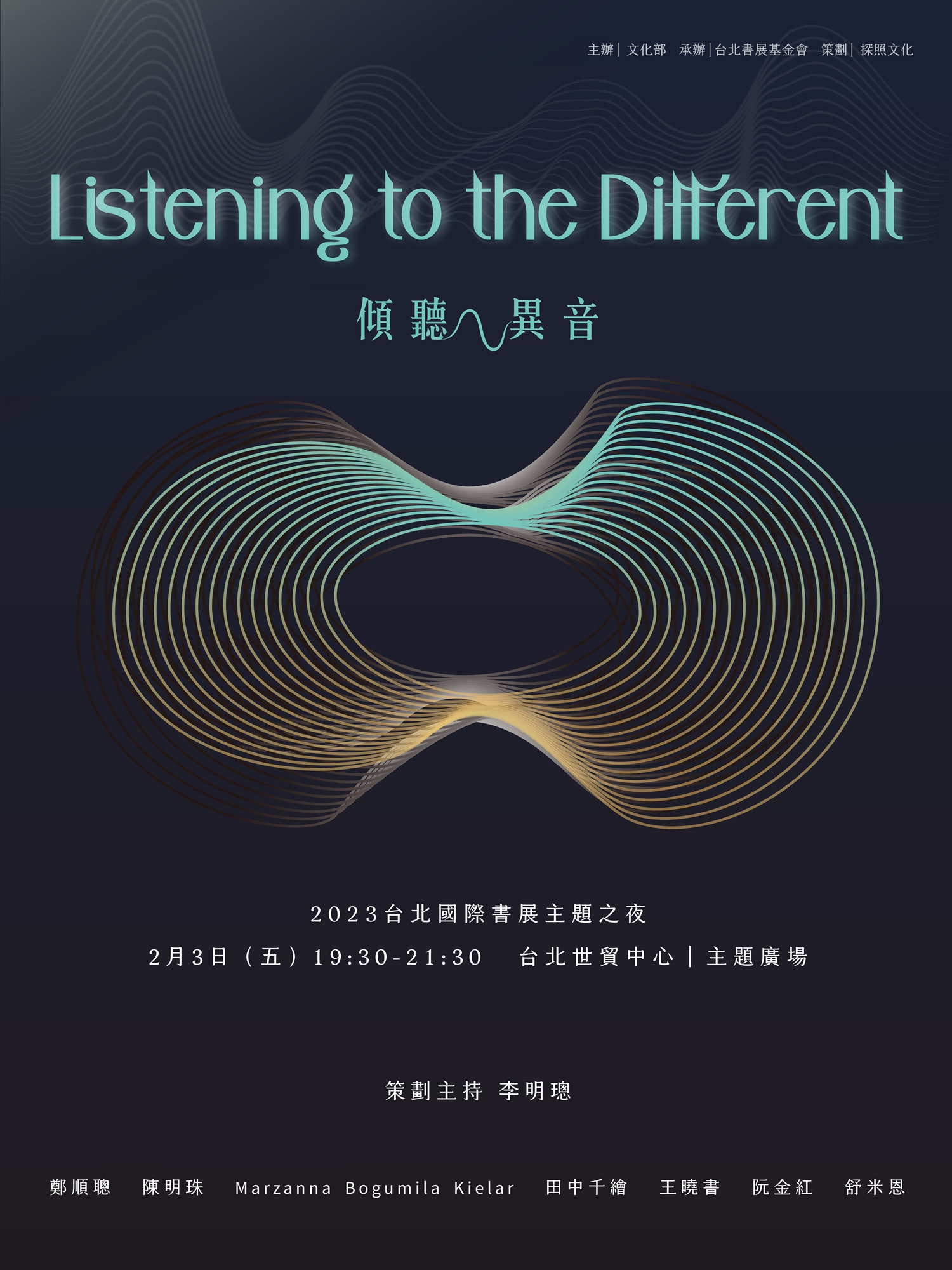 活動主視覺設計,有多重的象徵,既像不同話語聲響的波紋匯聚與交融,也像數學符號「∞」,有著無限大而沒有邊界之意。同時又呼應本次國際書展主題「閱讀的多元宇宙」,呈現在蒙昧黑暗裡透出啟蒙光暈的感覺。