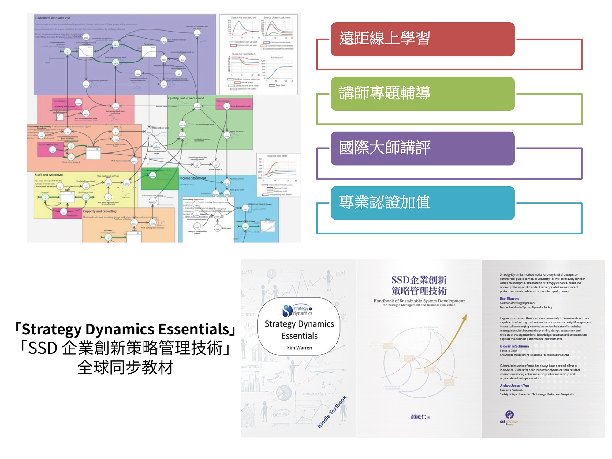 融合源自MIT 史隆管理學院的「系統思考」及「系統動態學」特色學科專業,與美國在職 MBA 名校 WPI 的「策略動態學」課程內容同步發展而成,學習結合系統思考管理以及動態情境電腦模擬分析的紮實專業技能,傳授如何運用電腦科學動態商業建模(Dynamic Business Modelling)建立企業創新成長、數位轉型和永續碳管理的機制,並運用創新事業策略規劃電腦模擬決策支援系統(Simulation-based Strategic Decision Support System),此支援系統可依據企業所屬環境、規模、產業特性、風險性質與營運數據,制定適切的模擬管理框架與流程,在實際策略選擇與執行前先行推演未來可能的成果與潛在風險,以降低重大錯誤決策並拓展企業經營成效,有助於邏輯與整合決策能力養成,且可應用於產業實務診斷,解決企業經營及組織管理實際問題,為目前全球最權威之商業策略評估應用方法。