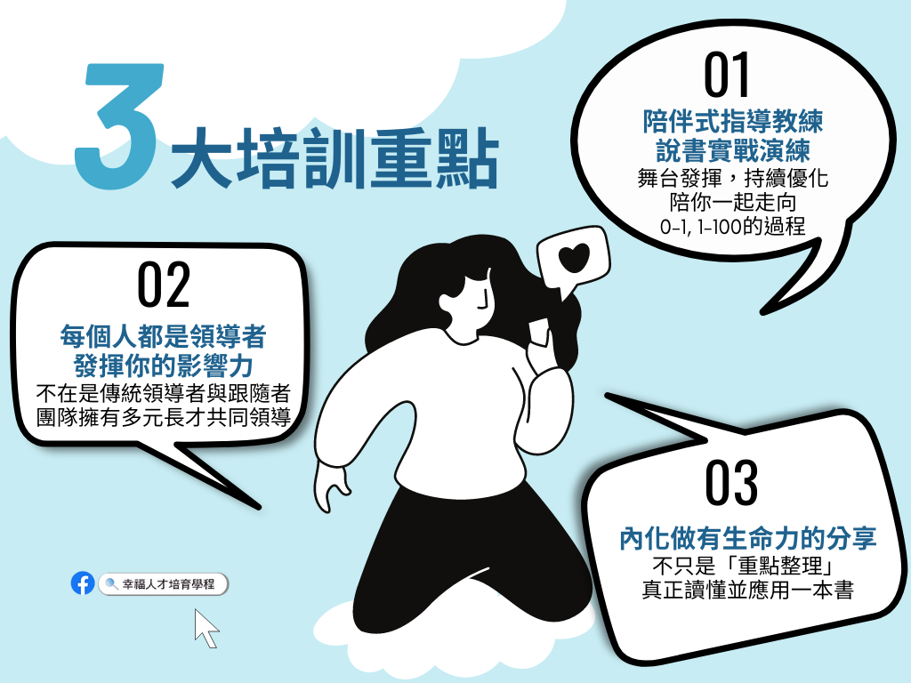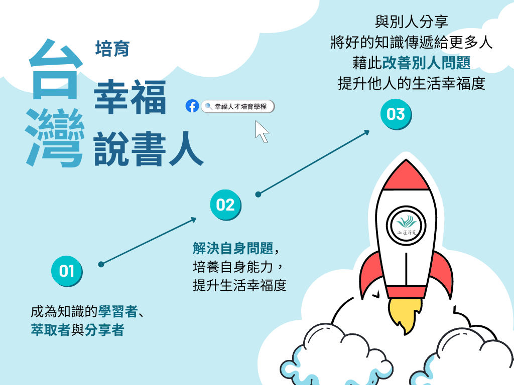 培養與學習邏輯思考、表達能力、有效學習、簡報製作、同理心、擴展思維。 - 分享書籍:分享是最佳的學習方式,利己又利他,產生社會影響力。