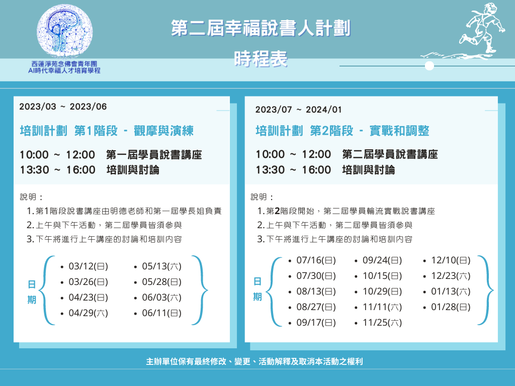 每月進行2次訓練,固定於週六或週日13:30~16:00 (2.5小時)。 - 分享 (2023/07~2023/12)