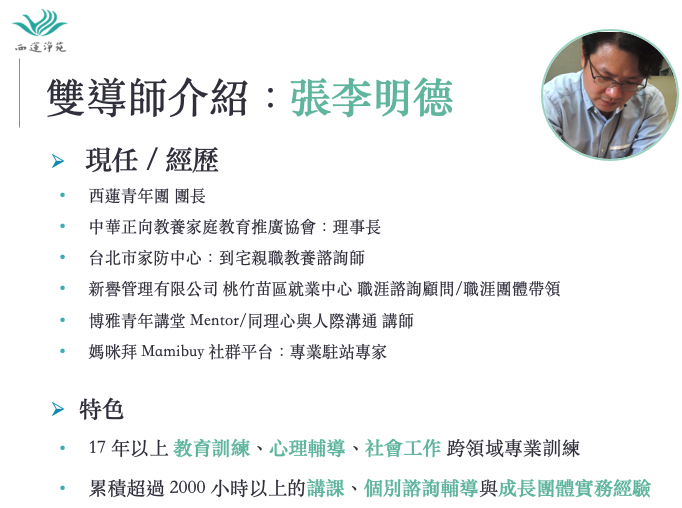 主題包含自我探索、有效學習 、有效溝通 、工作效能、關係經營。 - 學習說書:不定期課程訓練,兩週一次的說書演練及一對一導師回饋。