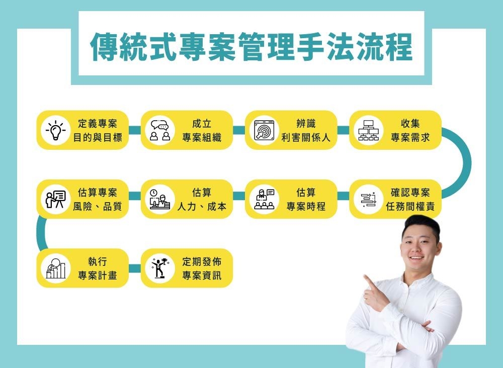 - 範疇/時間/成本/品質/風險/人力資源/利害關係人/溝通/採購/整合
