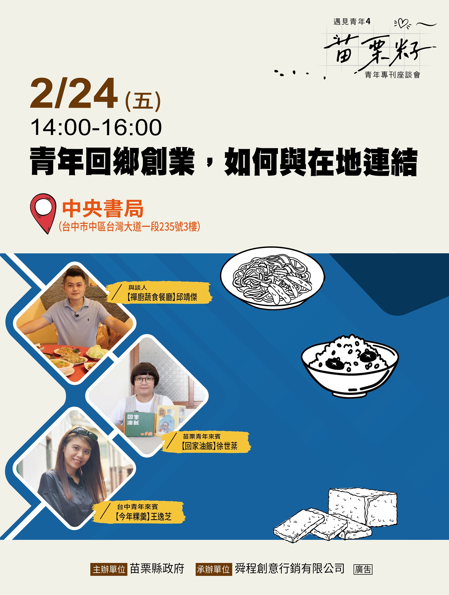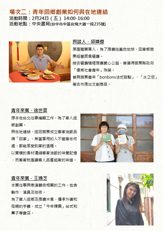 2月24日 (星期五) 14:00-16:00 | 中央書局(台中) | 禪廚蔬食餐廳 邱靖傑 | 返鄉青年 徐世棻(苗栗) 王逸芝(台中) | 青年回鄉創業 如何與在地連結 |