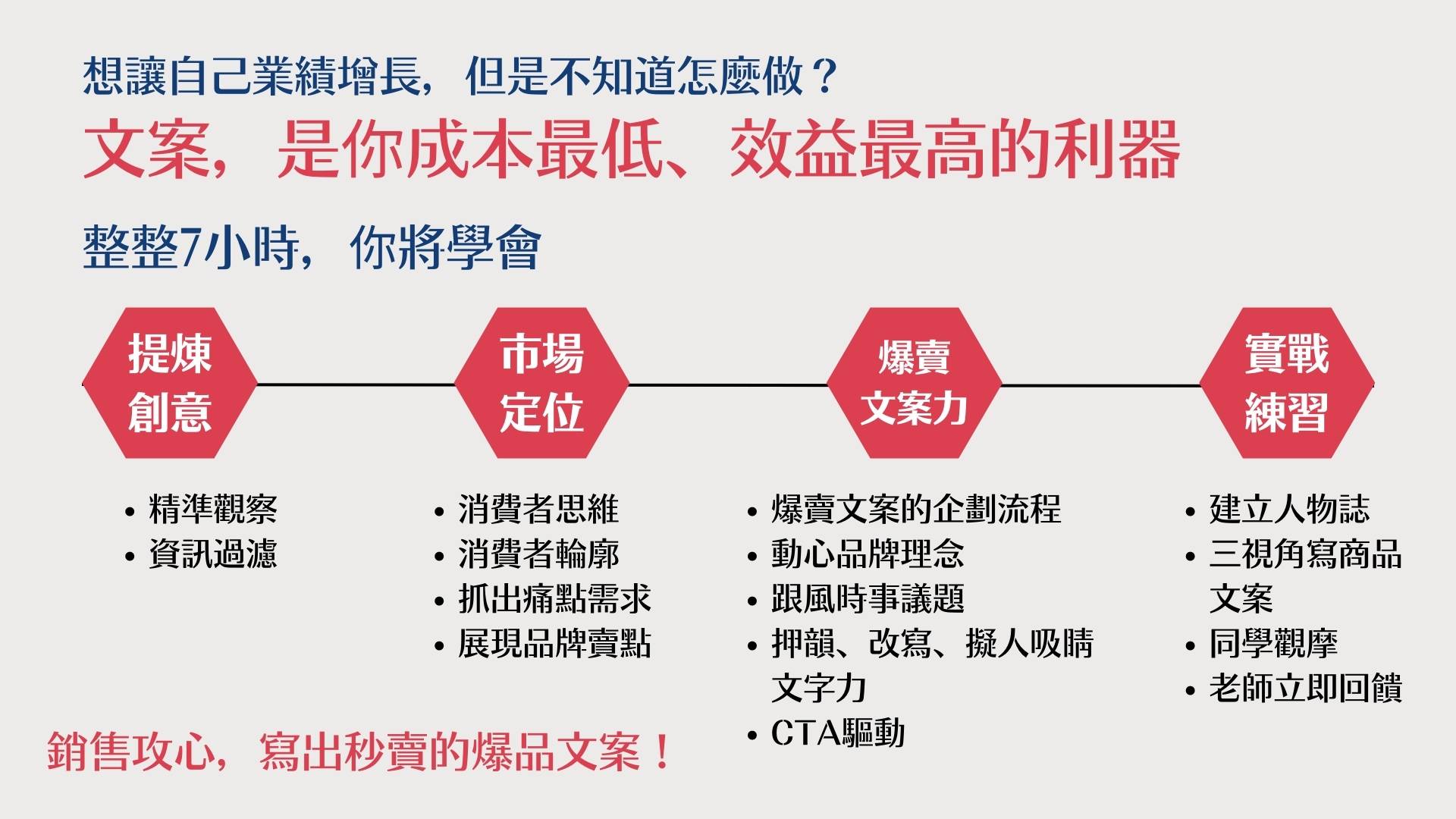 >>你將能寫出會賣的文案,業績壓力減輕,老闆賺錢也開心!