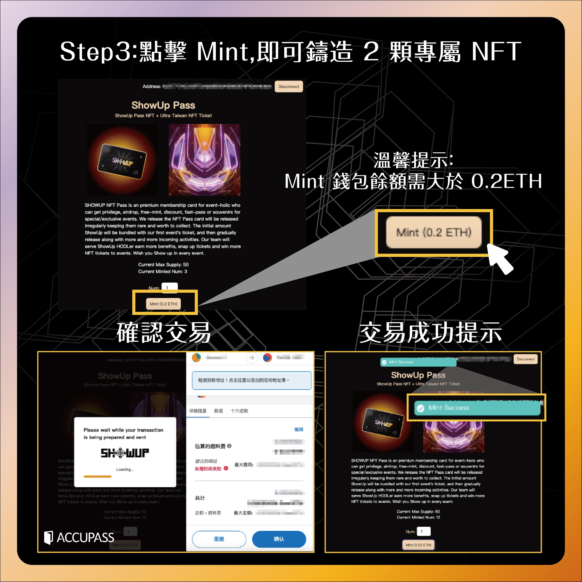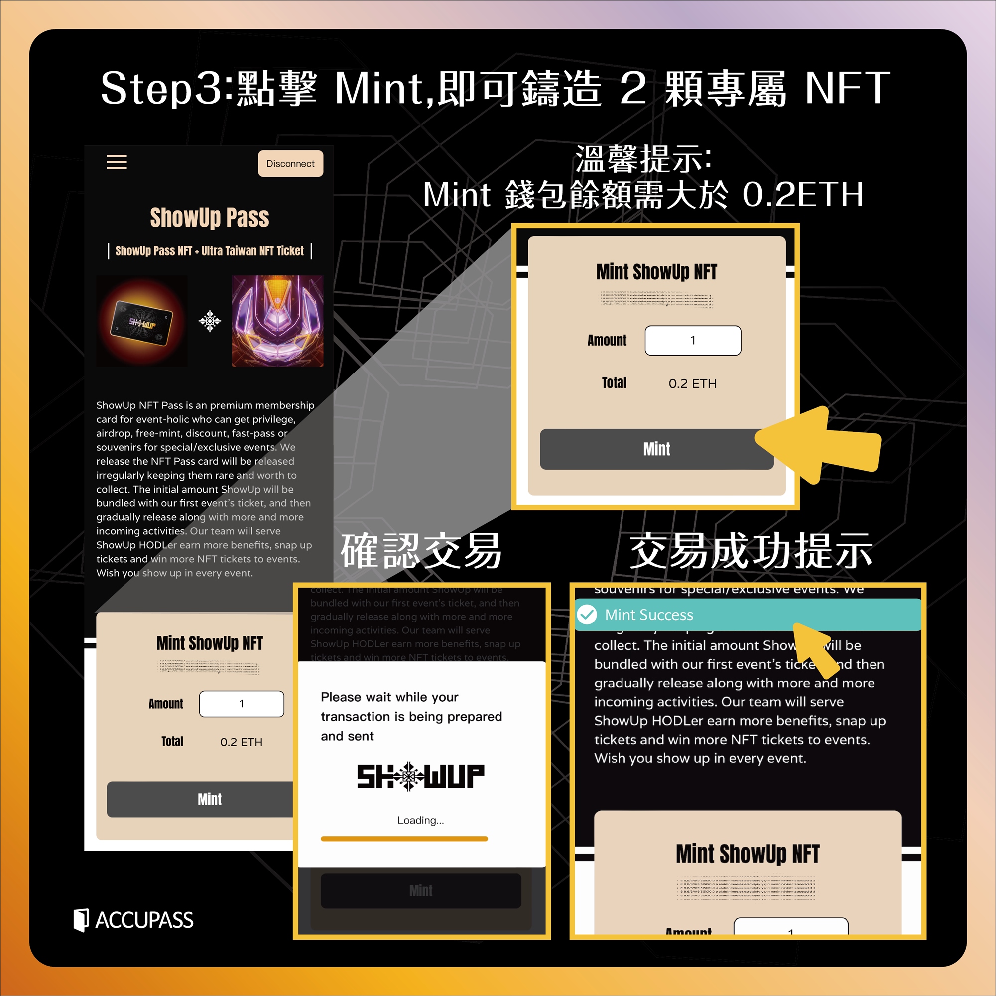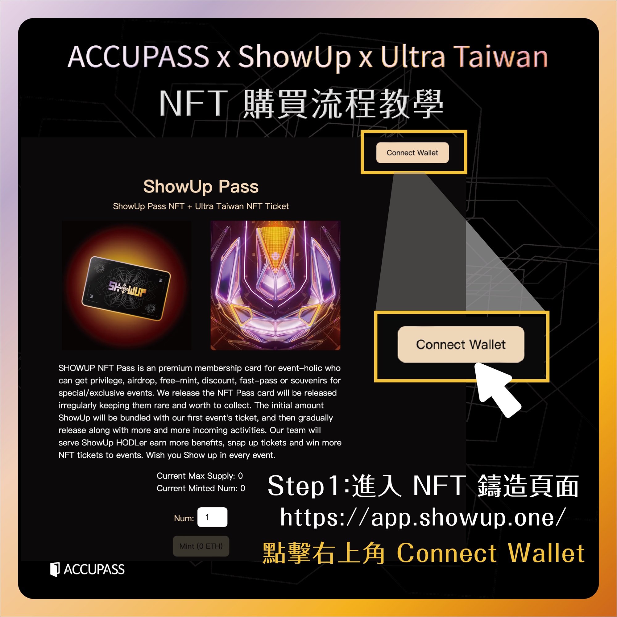 1. 關於 ShowUp NFT Pass 介紹及權益,均以官方介紹為主,詳情請參閱 https://www.showup.one/。本次是首次與 ACCUPASS 於 Web3 領域合作,所有 NFT 均以 ERC-721 的以太坊主網發行。
