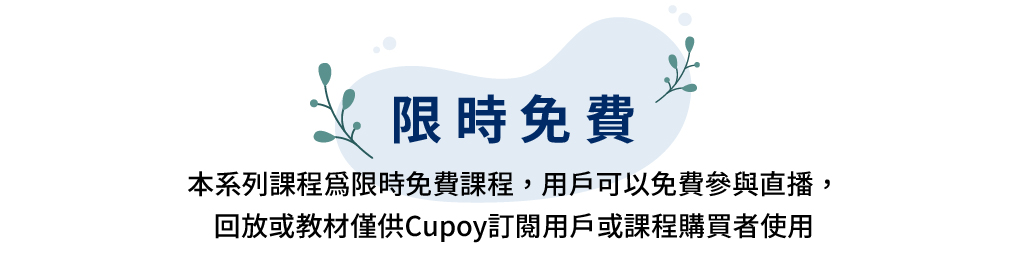 本活動之直播階段為開放免費參與,唯直播回放內容與課程講義屬於Cupoy訂閱或課程購買用戶可以存取,課程講義會在該堂課前開放期間限定試讀,直播課程結束後關閉。本活動之所有內容均屬本活動單位所有,未經本單位書面授權,任何人不得轉載或於任何場合公開。