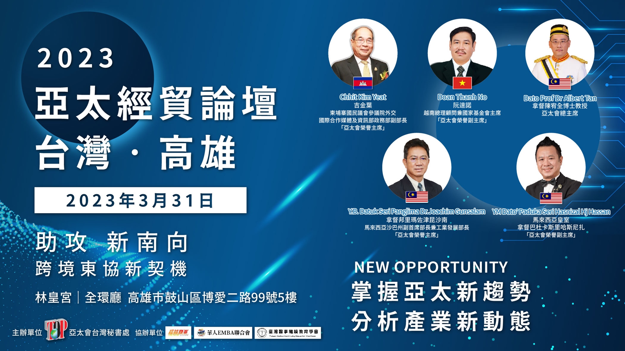 全球疫情趨緩,各國國門開放,你準備好了進攻嗎? 國際供應鏈變遷,臺灣產業南向發展新機遇,特邀請東協代表性國家部長,前來分享因地制宜的新南向商業模式,擘劃疫情後的調整策略,共同展望疫後市場新契機!為2023新春開年全新布局!歡迎共襄盛舉!
