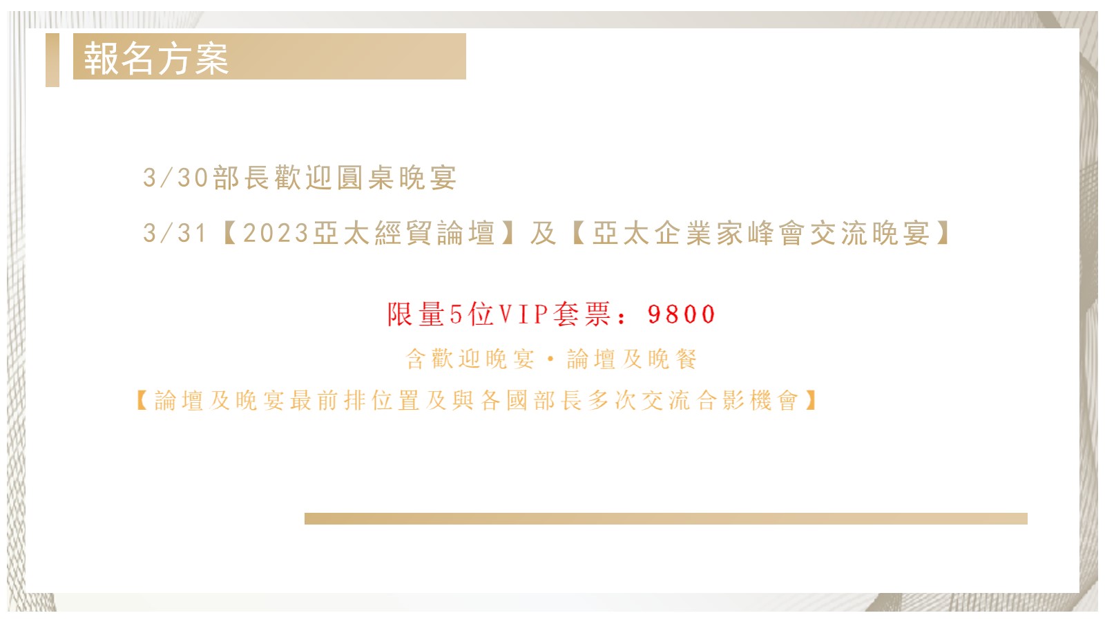 活動時間:2023 年 3 月 30日(二) 歡迎晚宴 (限量票)
