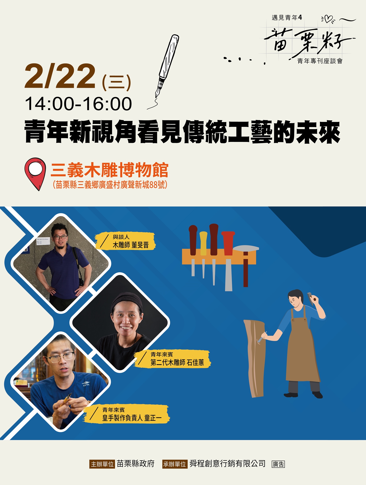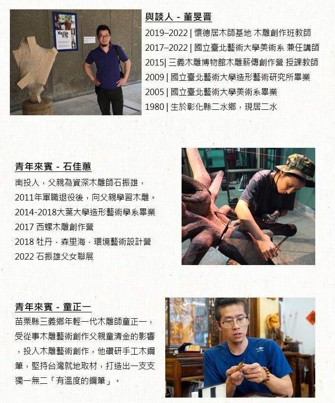2月22日 (星期三) 14:00-16:00 | 木雕博物館(三義) | 木雕師 董旻晋 | 二代木雕師 童正一(苗栗) 石佳蕙(南投) | 青年新視角 看見傳統工藝的未來 |