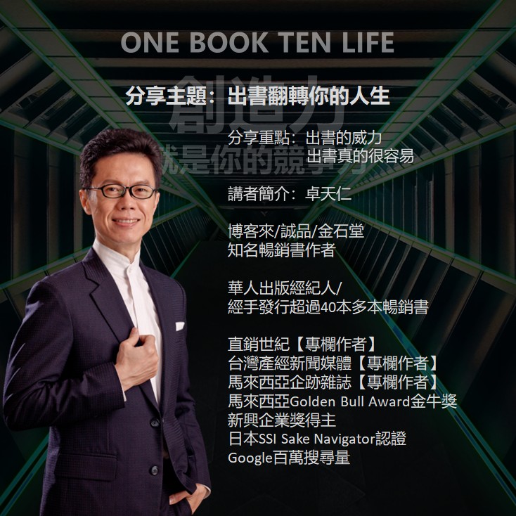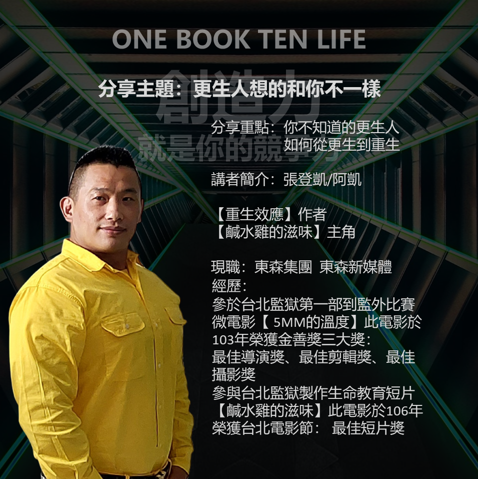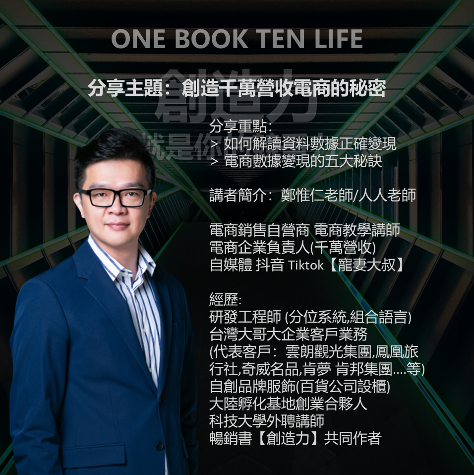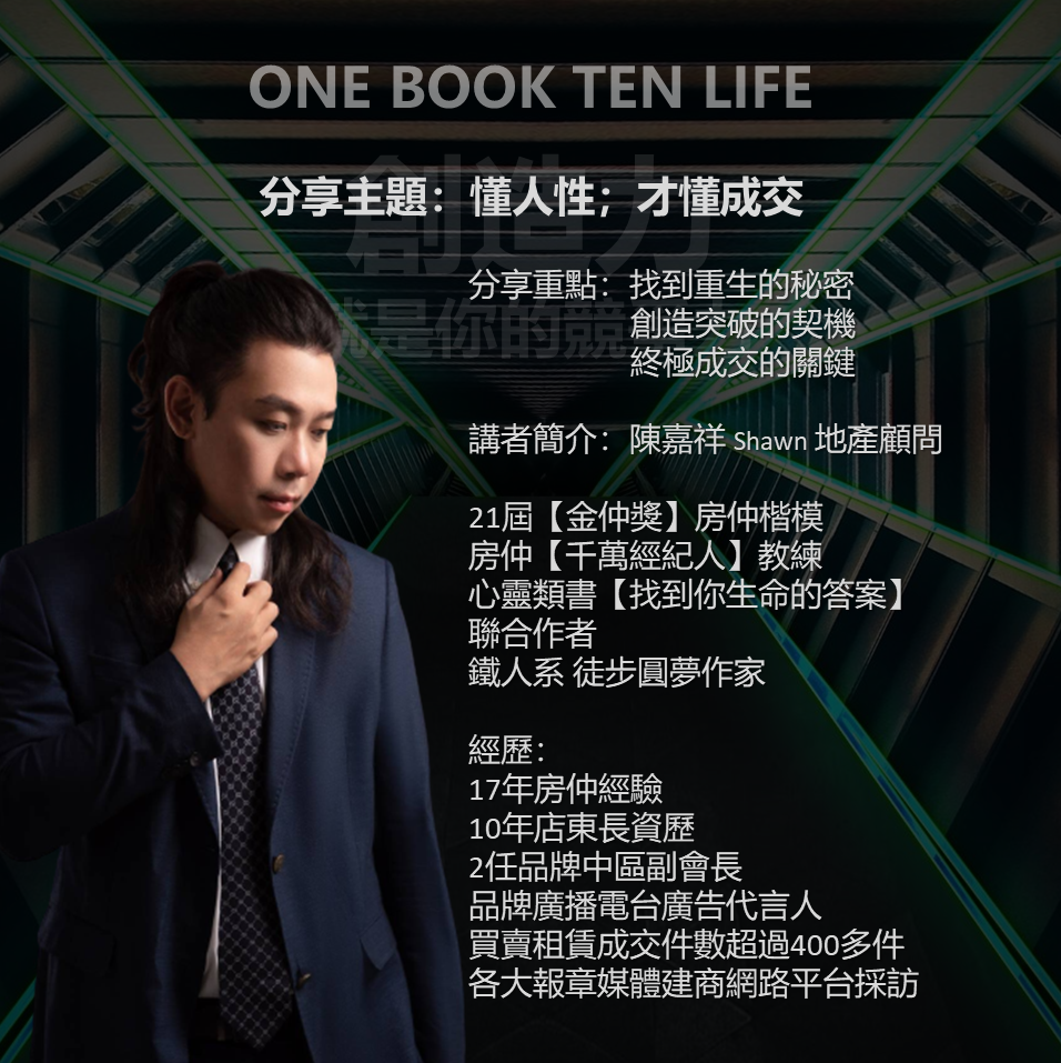 ONE BOOK TEN LIFE系列書籍講座,本次由Tiktok【寵妻大叔】&【千萬營收】電商企業主:鄭惟仁老師,加上【金仲獎】房仲楷模&房仲【千萬經紀人】教練:陳嘉祥,及暢銷書重生效應作者,【鹹水雞的滋味】主角:張登凱,與華人出版經紀人:卓天仁,攜手前進到高雄,與南部的朋友一同見面分享! 場次只有一場,機會難得... 請踴躍報名參加!