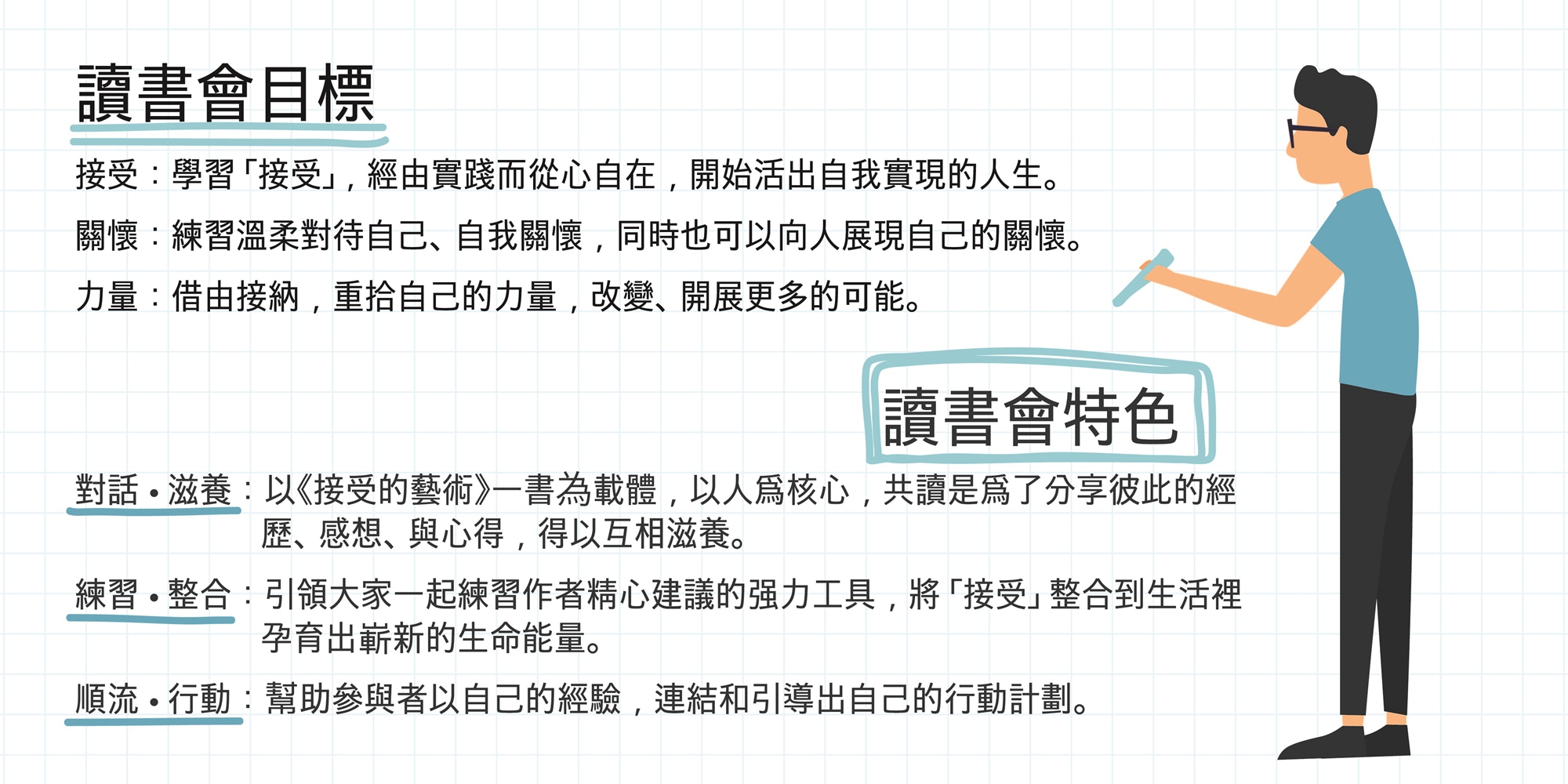 借由這一次的讀書會,讓我們一起學習主動選擇接受,不再與現狀之河對抗,重新獲得內在平靜,自我實現的力量。