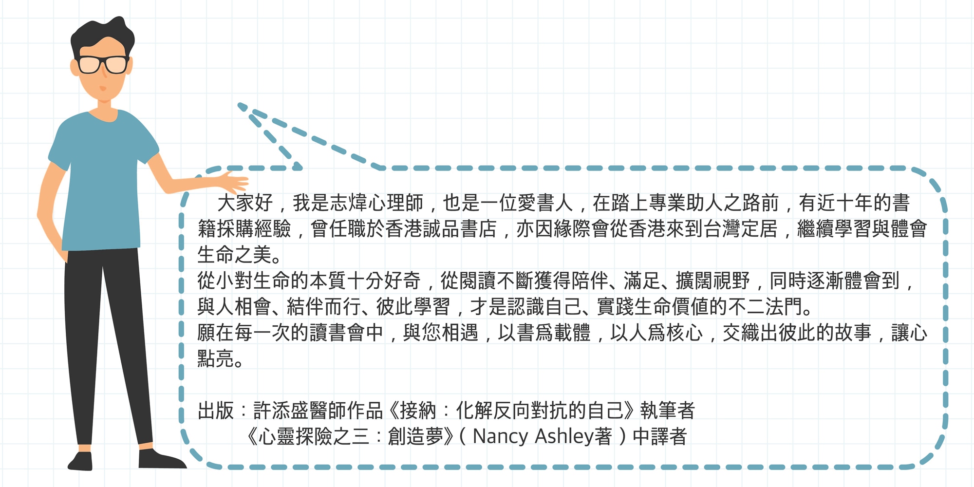 ※ 如果您能夠在參與讀書會前安排時間預讀,可以幫助您醖釀心得和問題討論;如果沒有預讀,也可以就您在讀書會裡的看見與吸收,發揮與分享您當下的所思所感──每一位參與者,都可以用感到最輕鬆與舒適的方式來參加本活動。