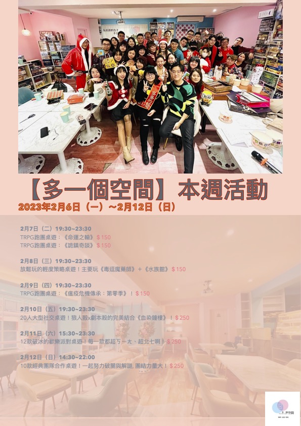 「多一個空間」由【多多看電影】的部落客-多多 所創立,一個致力於舉辦各種娛樂活動的場地,是一家複合式桌遊咖啡店,座落於龍山寺捷運站3號出口,視覺裝潢以馬卡龍粉與湖水藍為主要色調,與附近巷弄的古宅呈現極大的跳躍反差。