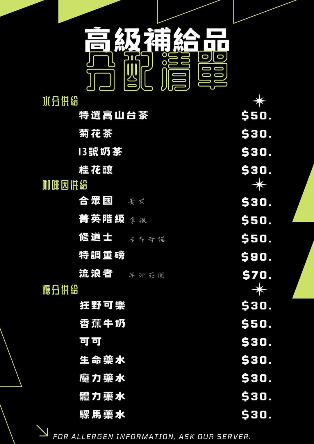 特調飲料價目如下!