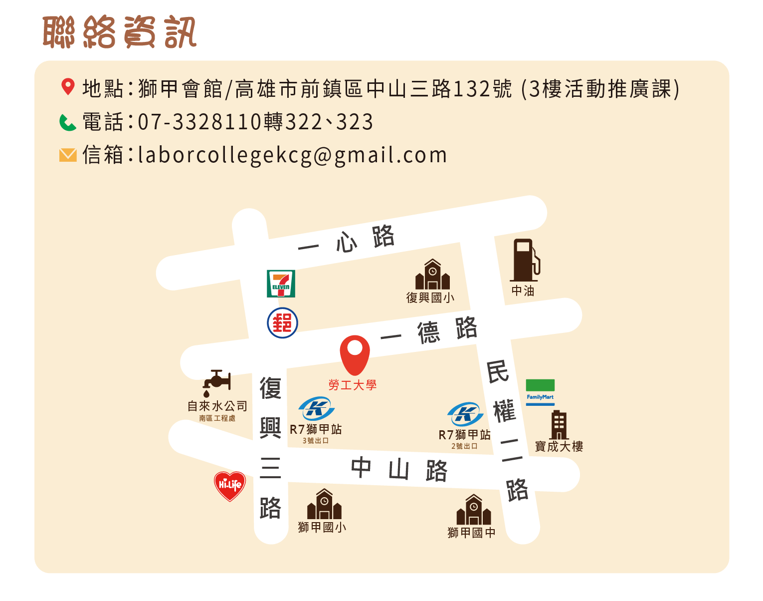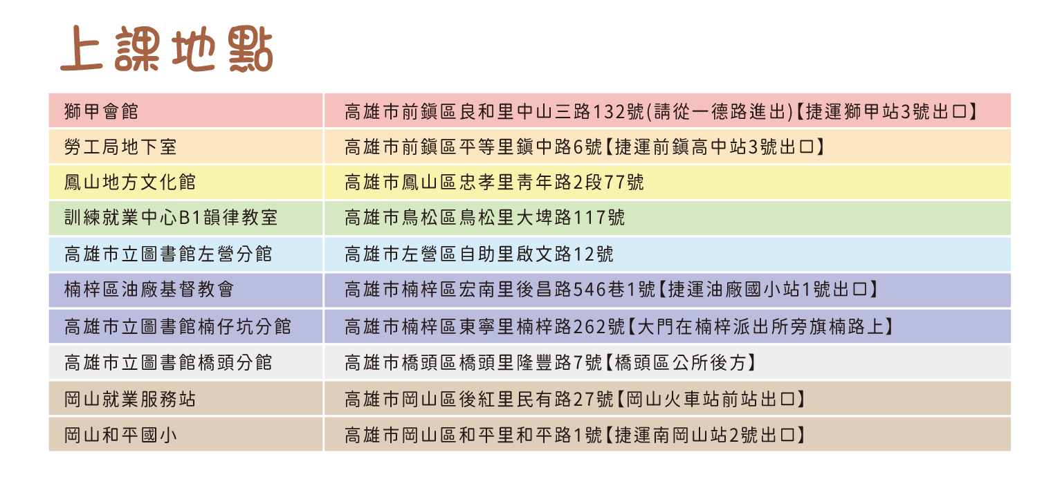 【開課條件】每門課程報名人數須達10人始開班,因人數不足致無法開課之班別及退費事宜,於開課前一週公告於勞工大學網站「最新消息」(http://college.kcg.gov.tw/)。