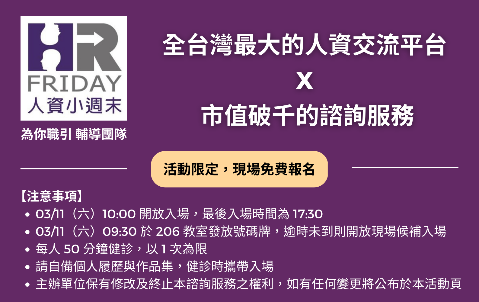 由「人資小週末 為你職引 輔導團隊」的資深人資工作者提供 1 對 1 敏捷式職涯健診服務,建議你可以探索與接觸的社會創新組織,以及行動方案,只要來現場全都免費。
