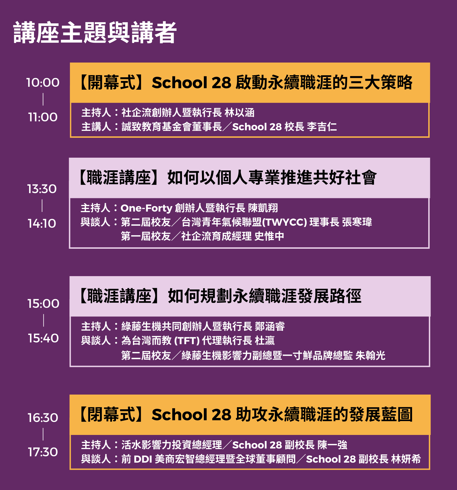 由 School 28 校友與社會創新組織創辦人對談,從校友的計畫收穫、轉職歷程出發,一起來聽聽他們對永續職涯的看法與規劃。