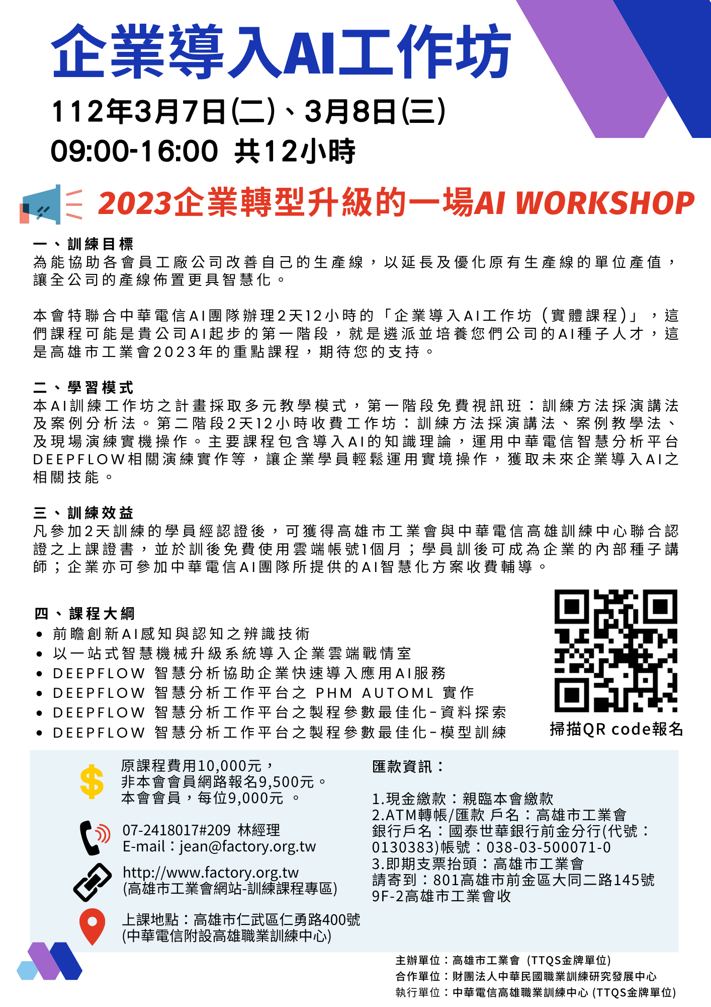 - 高雄市工業會特聯合中華電信AI團隊辦理2天12小時的「企業導入AI工作坊 (實體課程)」。這門課程可能是貴公司Al起步的第一階段,就是遴派並培養貴公司的第一批Al種子人才,這是全台灣2023年的重點課程,學員在高雄風光明媚的澄清湖畔舉行,外縣市學員可安排自費住宿。
