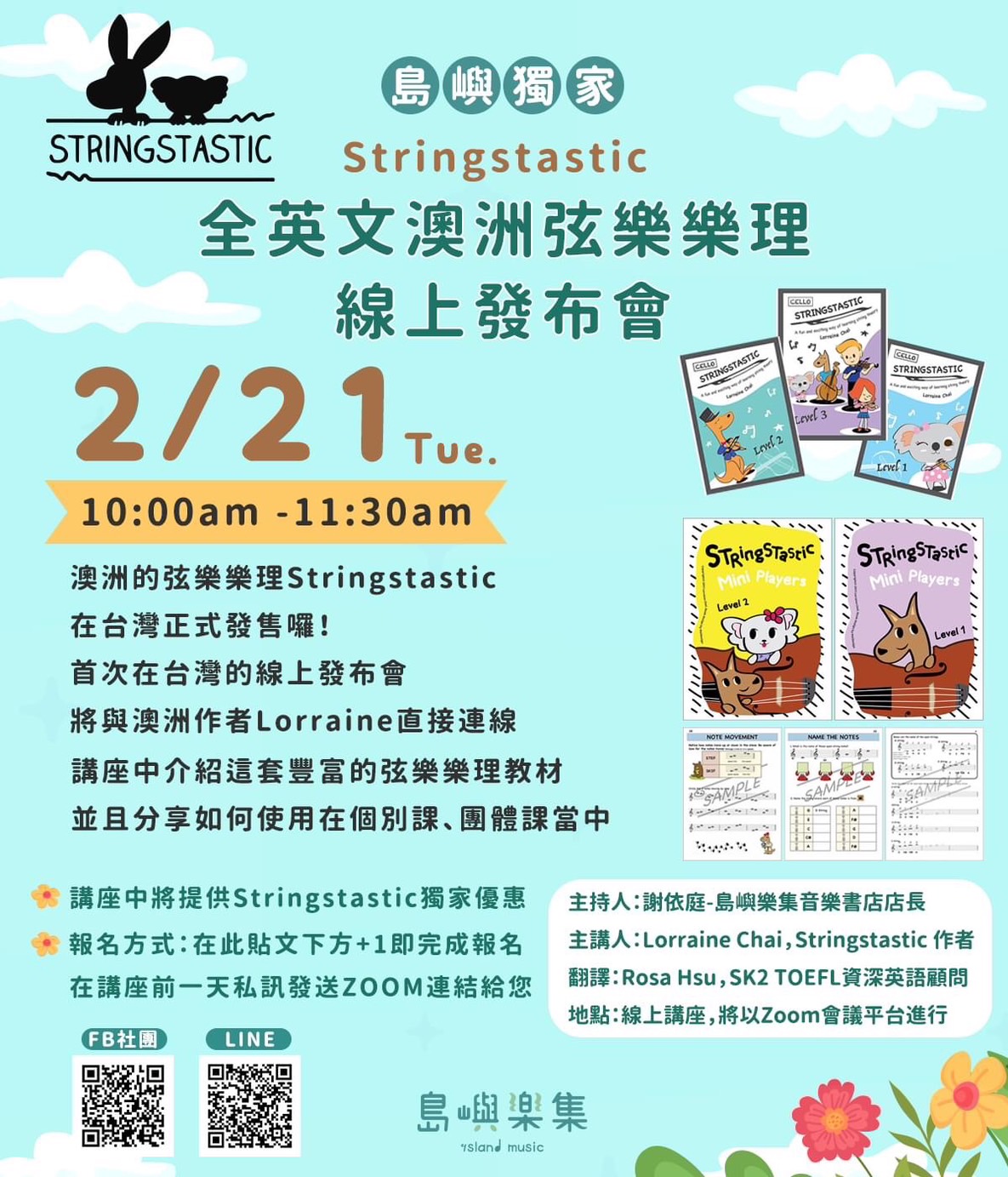 講座中Lorraine為我們介紹這套教材,並且引導老師們如何使用這套弦樂樂理在個別課、團體課當中!非常歡迎大家來共同參與!當然還有Q&A的時間,請把握這次與作者見面的機會將你對這套教材的疑惑一網打盡吧!