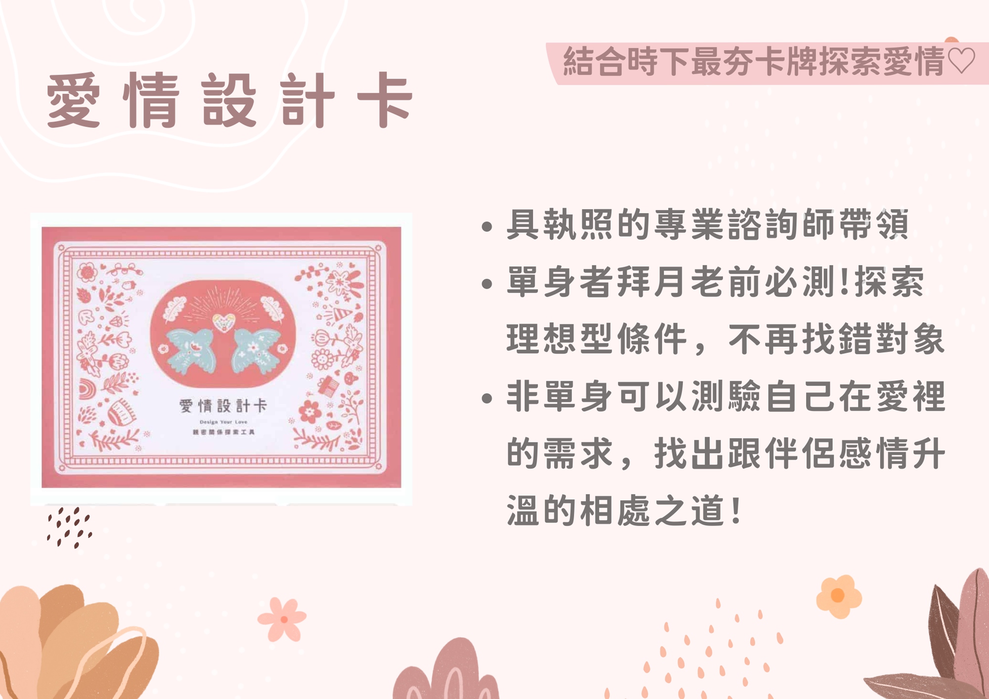 | 20:00 ~21:00 | ◆我渴望的伴侶特質/行為條件是? 1.透過愛情設計卡的價值卡選出自己適合的伴侶類型,分別擁有怎樣的特質?他們平常又會怎樣的對待人呢? 2.透過愛情設計卡的行動卡選出自己喜歡怎麼被對待,可以在關係上與伴侶好好溝通,讓感情更加升溫! 抽完會有的收穫: ➤ 怎樣特質的人,適合成為我的潛在伴侶? ➤ 您喜歡在感情上希望如何被愛