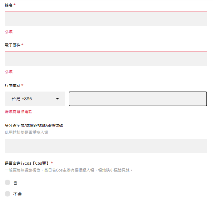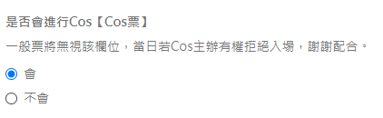 如果選擇COS票,請在訂購資料內填寫是否會進行Cos,一般票券則會忽略該欄位。