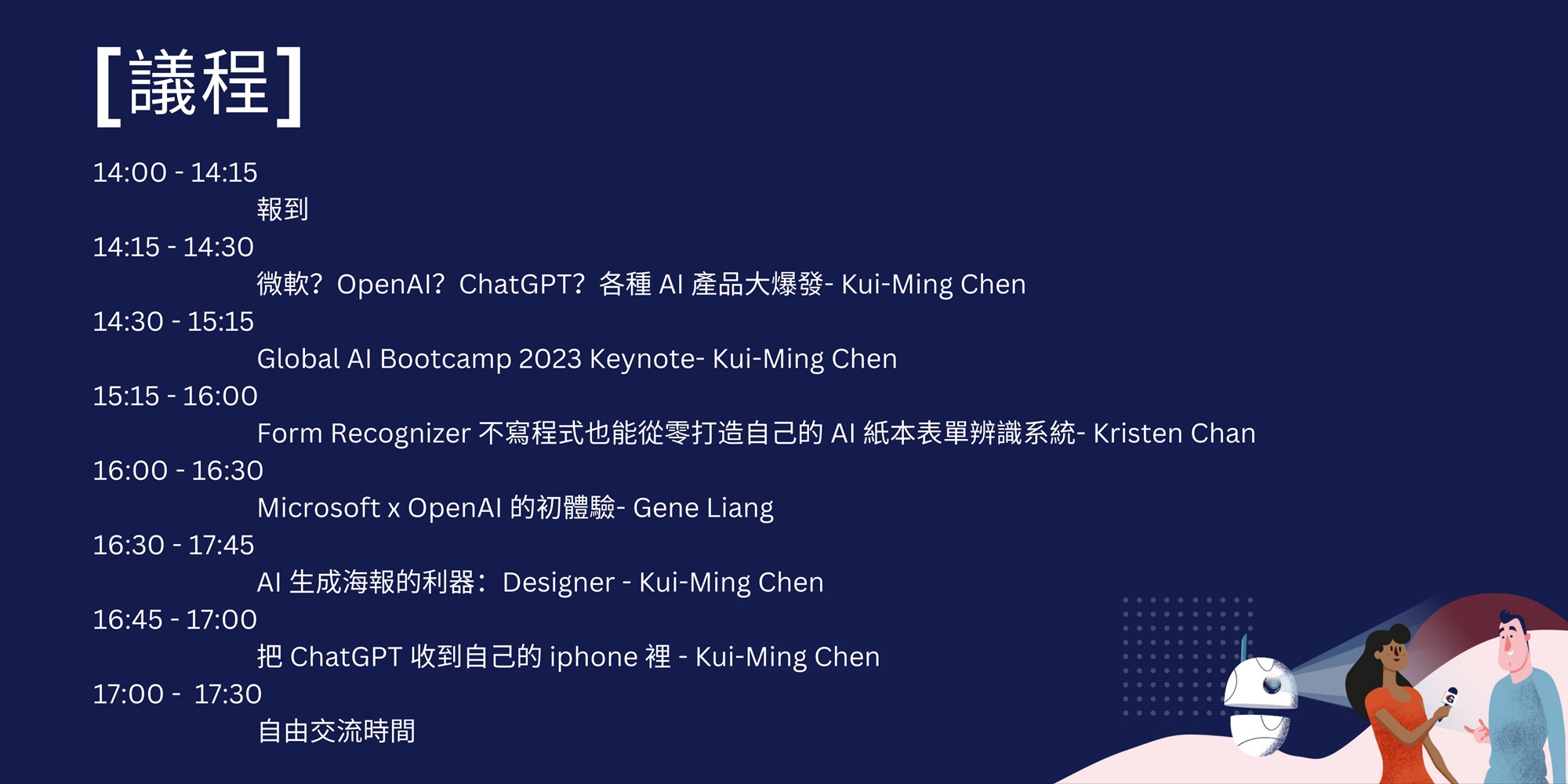 2023 年即將是 AI 大爆發的一年,不但各種超強人工智慧會橫空出世,更多衍生出來的軟體應用,可能會無孔不入地入侵你的生活!為了讓大家無痛接軌跟上這班車,本活動邀請了微軟的專家們,用3小時的時間,讓你追上這個 AI 畫圖和對話機器人的時代,快速站上 AI 浪潮!