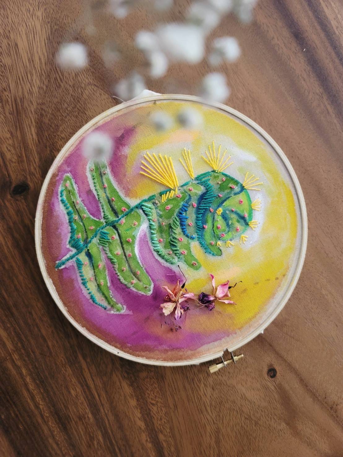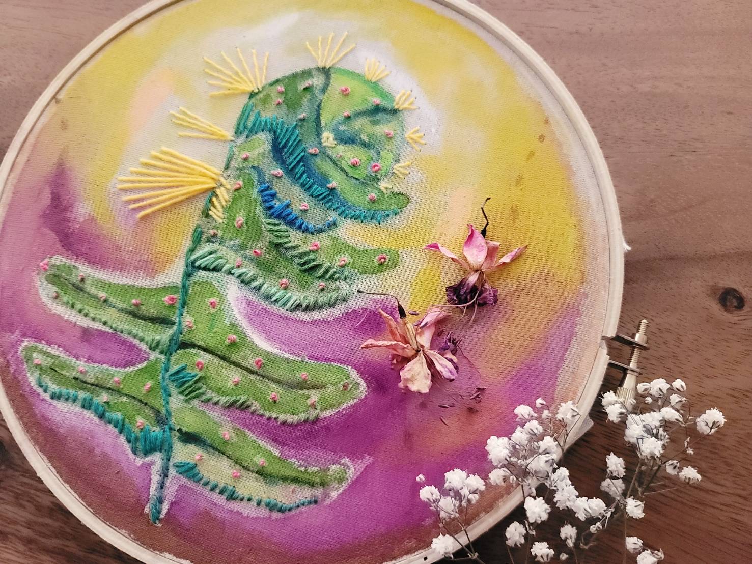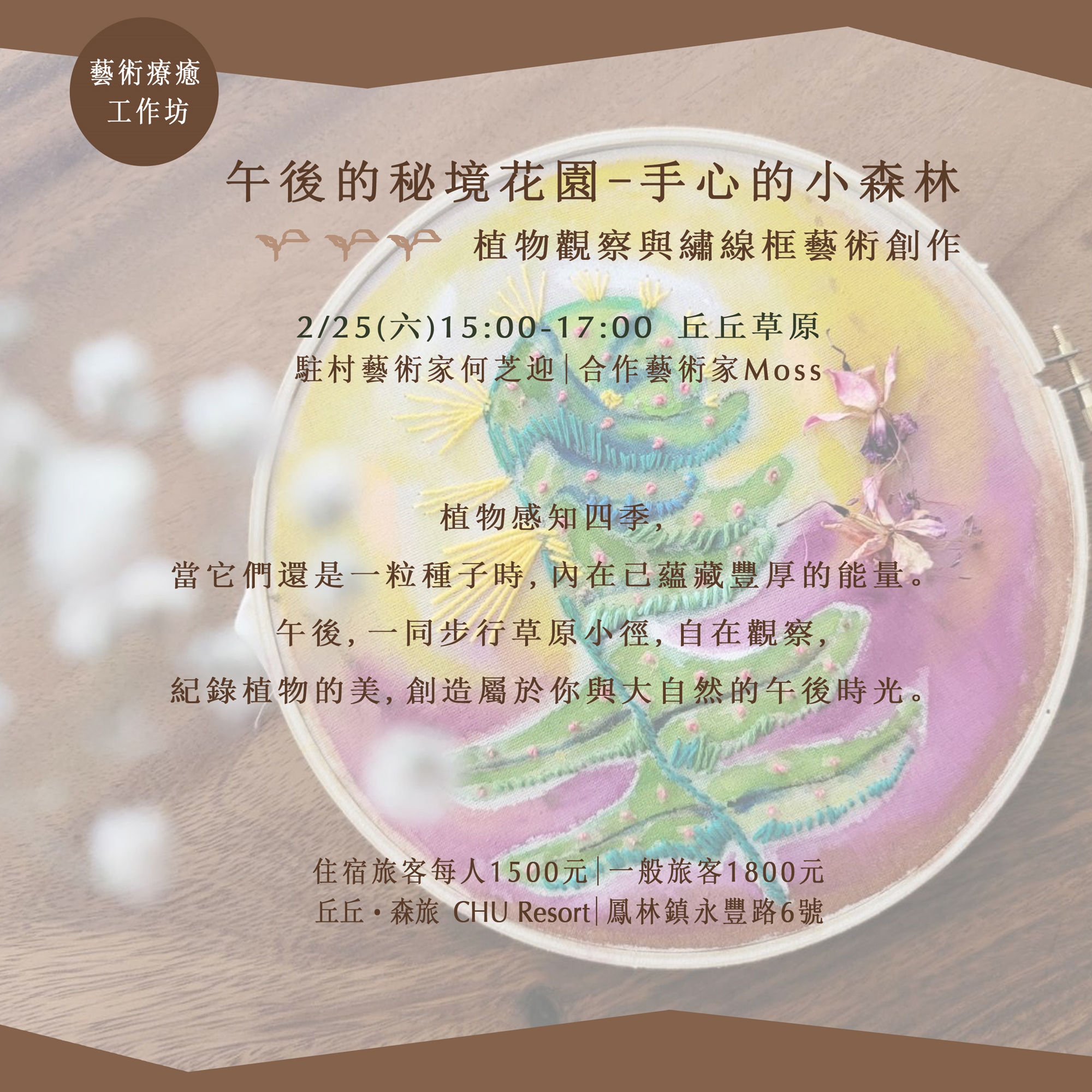 植物感知四季,當它們還是一粒種子時內在已蘊藏豐厚的能量。歡迎喜愛植物的你/妳留下這個午後,放鬆自在地步行於園區小徑,慢慢地觀察草地、野花、樹木及遠方大山,我們可以拿起紙筆觀察紀錄漫步上的美好事物,透過顏料媒材繪畫,也可以繡上彩色刺繡,創造出獨一無二的精巧的繡線框作品。一座歡樂的小森林從我們的手心慢慢長出。