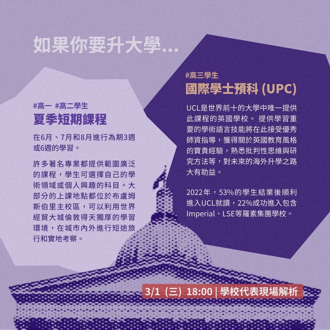 本次講座特別邀請到UCL CLIE學校代表Yoshie主講,向您介紹申請注意事項、流程與學習表現;講座後也有保留一對一諮詢的時段,可以攜帶成績單,由校代建議最合適的申請準備。歡迎有需要的同學多加利用!