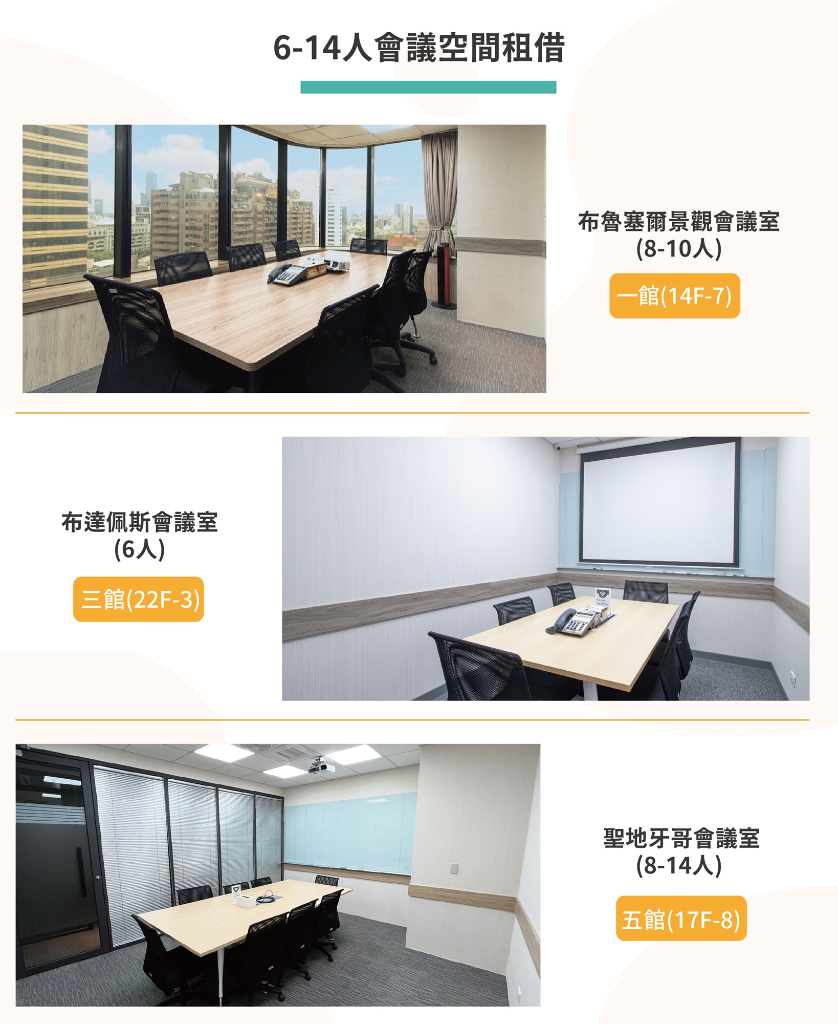 ▴提供6-14人小型會議室,適合 商務會議、簡報提案、面試訪談、讀書會、公司內訓。