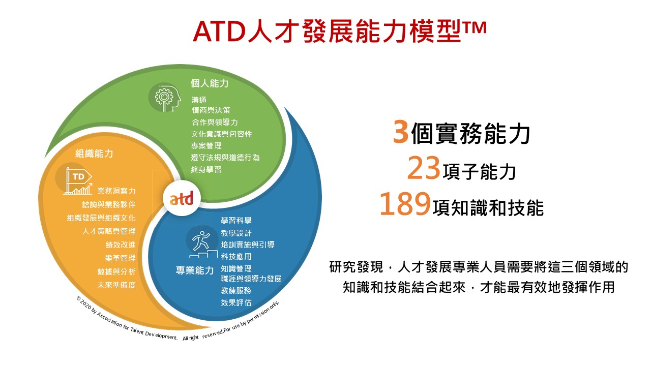 ATD 人才發展能力模型是全球唯一被認可的知識和技能需求架構,專門針對人才發展專業人士。該模型經過40多年的淬鍊及研發,包含3個實務能力 (個人能力、專業能力、組織能力) , 合計23項子能力,總計189項知識和技能,它可以幫助人才發展專業人員了解自己的能力,以及如何應對當今職場的挑戰。