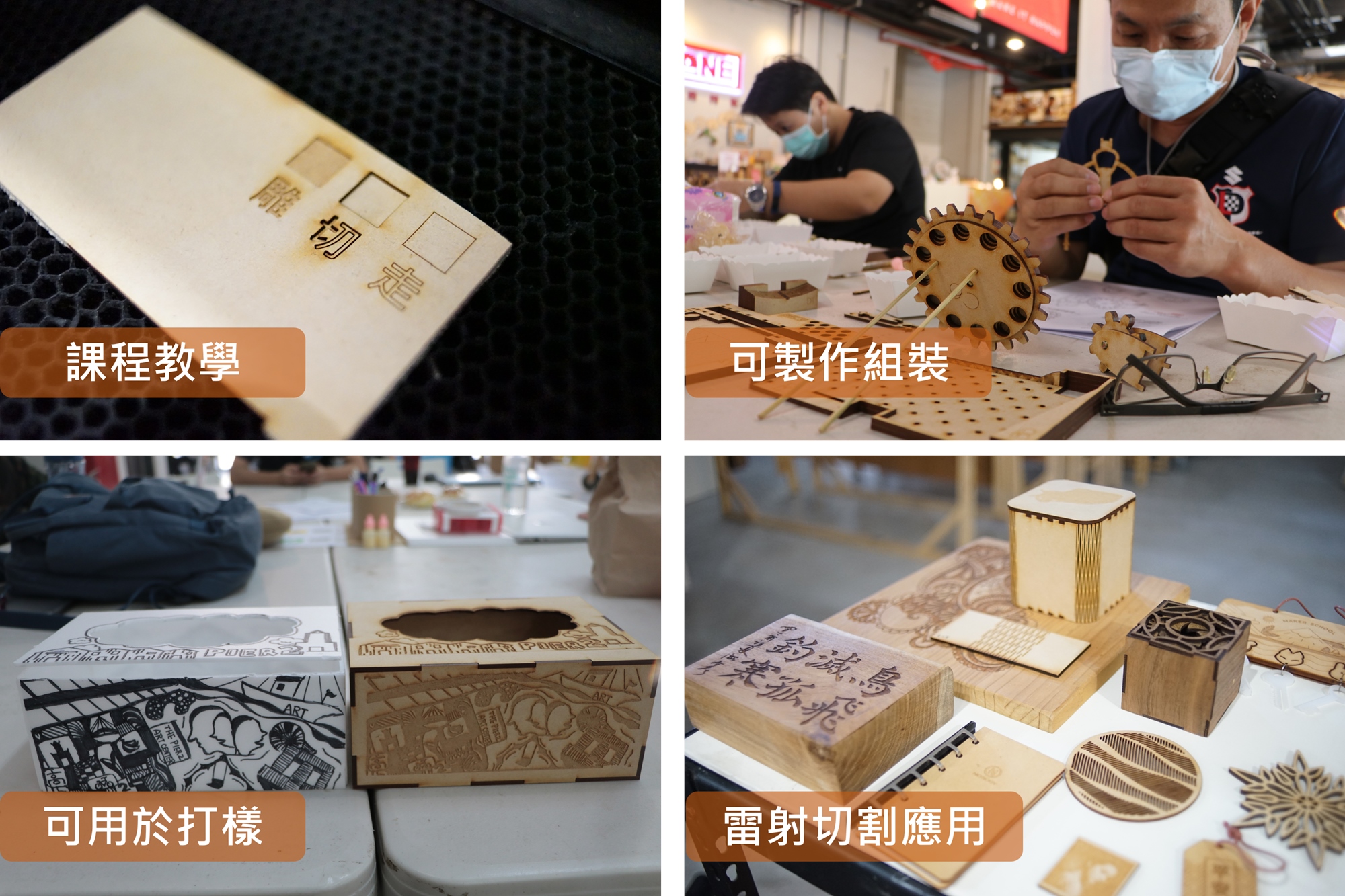 雷射切割機,是運用高能量的雷射光束打在材料上,以進行切割或雕刻之機器。可加工於木頭、壓克力、紙張等不同材質,進行精密的刻字、切割或雕刻。而根據材質不同,所呈現出的效果也不同。適合用於產品設計快速打樣、製作玩具、紀念禮品及客製化創意商品等。