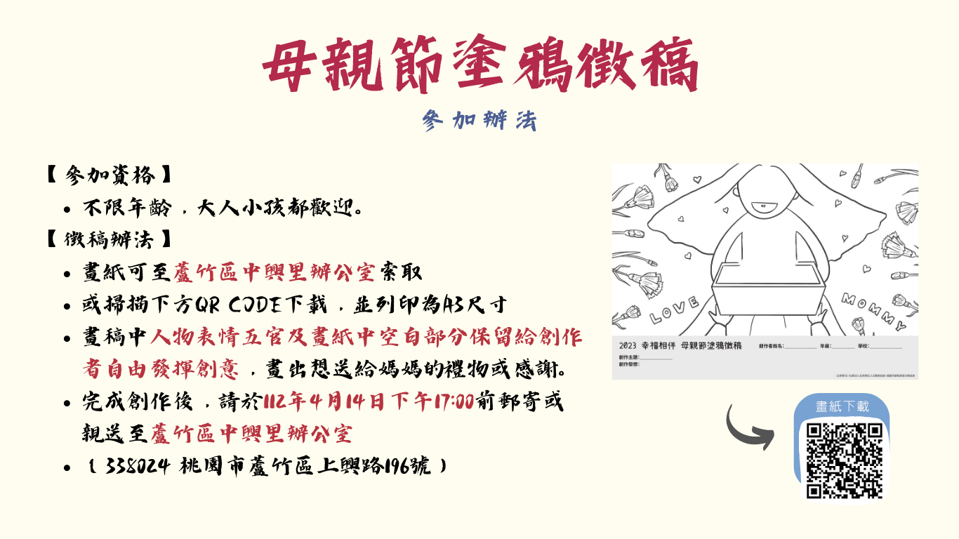 【 畫紙下載 】https://pse.is/4rw93b 參加徵稿拿市集折價券完成作品繳交或郵寄 請務必填寫活動報名表單 以便製作參加證明及禮品【聯繫主辦單位】03-3234902社團法人台灣璞石人文關懷協會 http://www.facebook.com/pushi0928桃園市碧瑤慈善文教協會https://www.facebook.com/pi.yao18桃園市新聞記者協會【協辦單位】桃園市蘆竹區中興里辦公室友善小姐社會企業有限公司http://www.facebook.com/missfriendly89鼎爍傳媒有限公司http://fanjking.weebly.com/桃園市中興社區發展協會蘆竹區救國團團委會桃園市厚德愛心協會