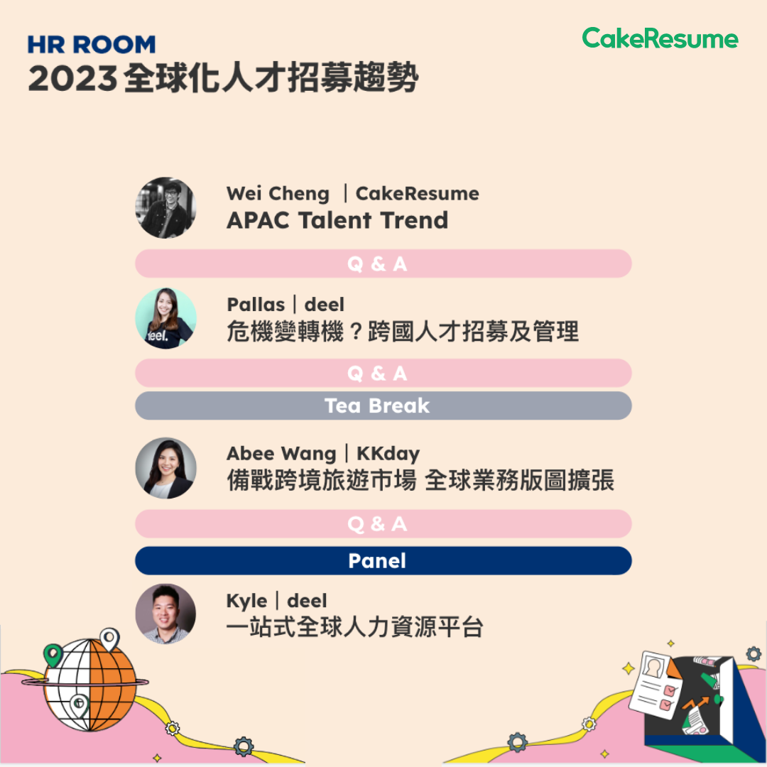 HR Room 人資小房間是由 CakeResume 國際人才求職平台所主辦的一系列人才趨勢座談會,本次主題為「2023 全球化人才的招募趨勢」,集結了知名跨國企業與新創公司,邀請到業界知名的全球人力資源平台 deel、國際人才媒合平台 CakeResume 以及跨多國協作的 KKday,分享 2023 年全球人才招募市場最新趨勢。