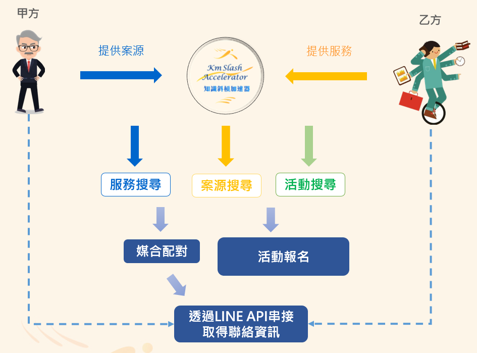 聚焦於知識接案媒合服務,提供知識斜槓者多元化的商務交流活動曝光渠道,促成甲乙雙方觸及、媒合、成交及更多商業合作機會,並透過實體活動的接觸與連結,消弭甲乙雙方的資訊落差,平台媒合服務預計於2023年Q3正式上線