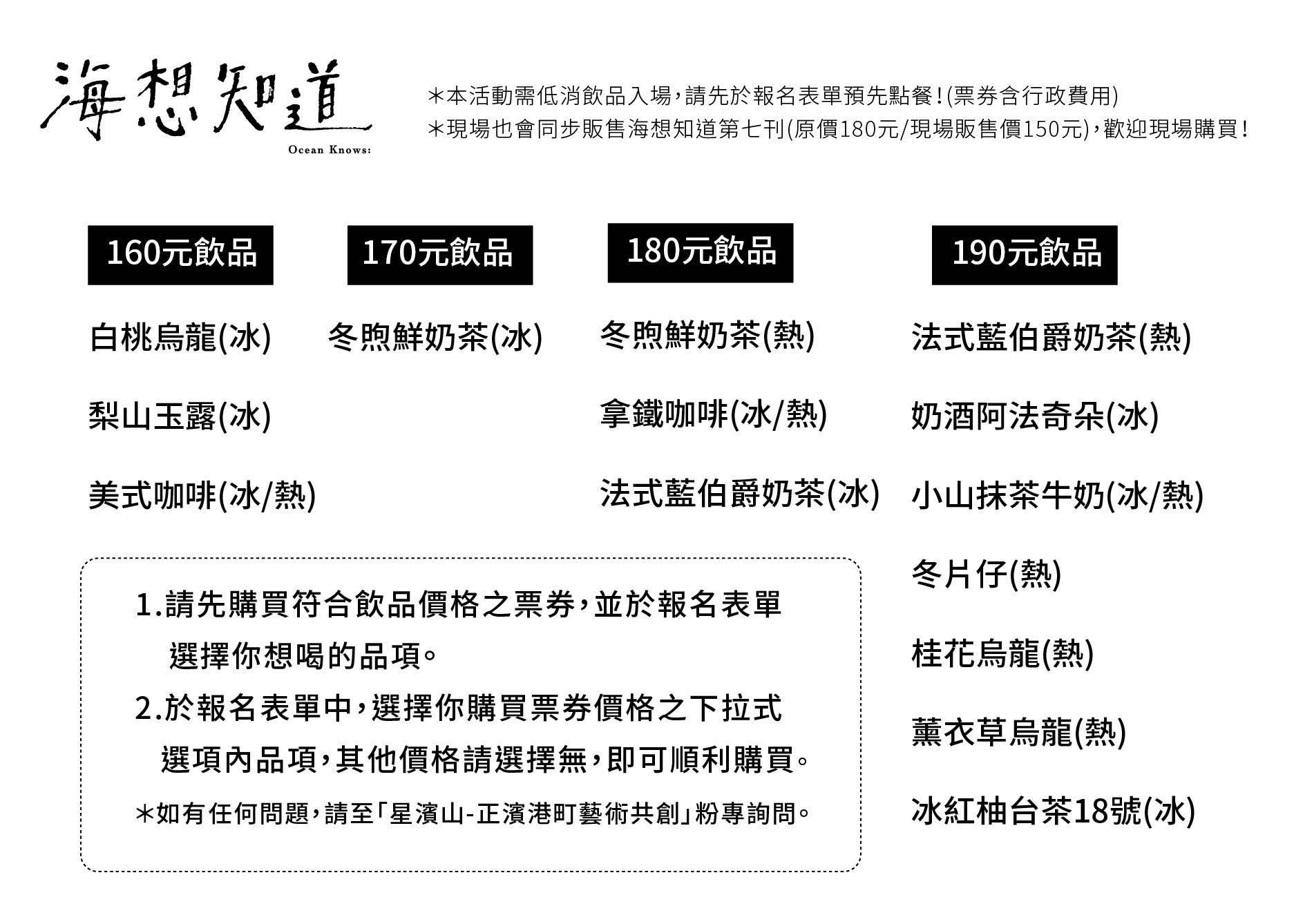 (3)由於場地坐席有限,以及低消飲品製作需時間,請預先於票券預定您想要的飲品,敬請見諒。