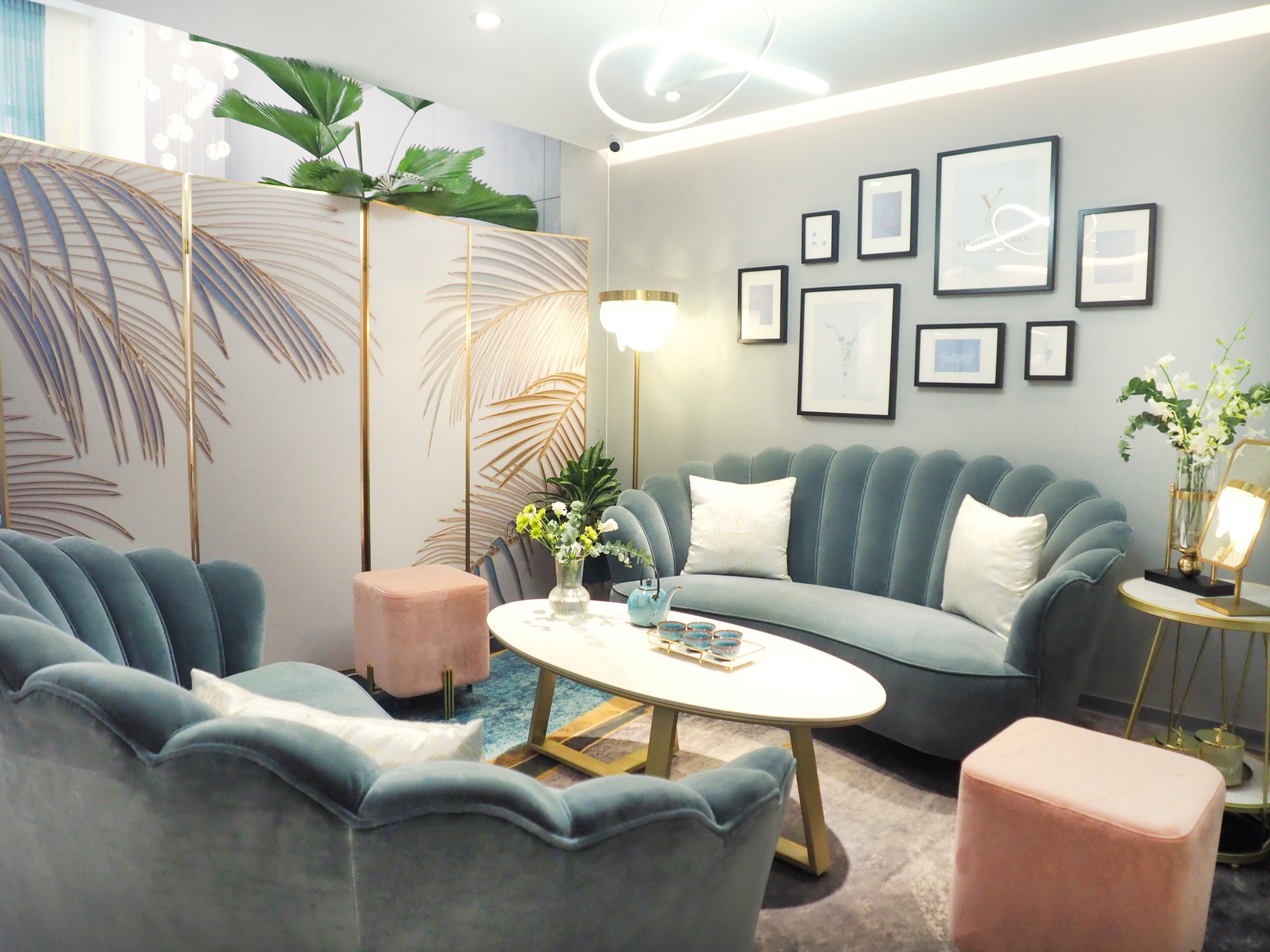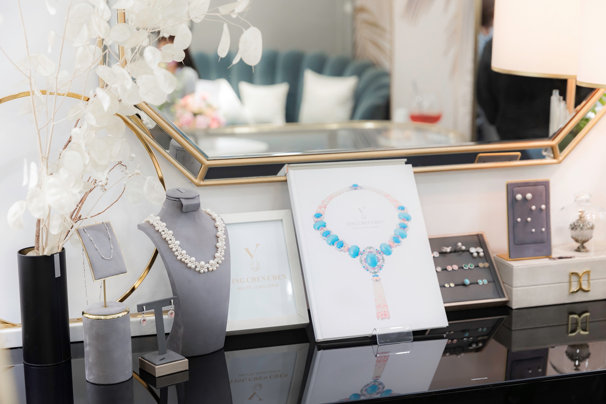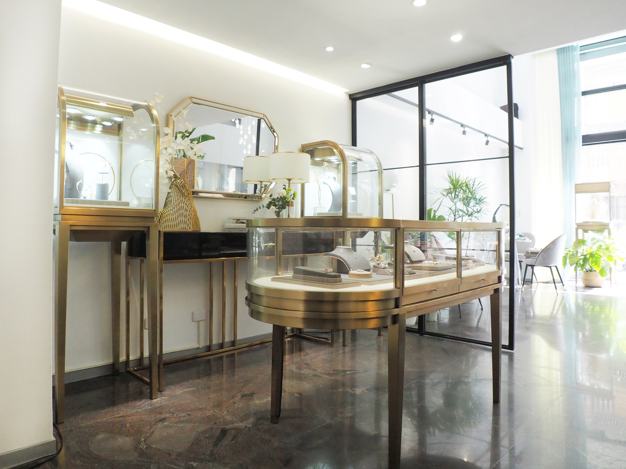 除了珠寶展示區外,現代優雅舒爽的環境中點綴綠色植被與精緻珠寶畫作,