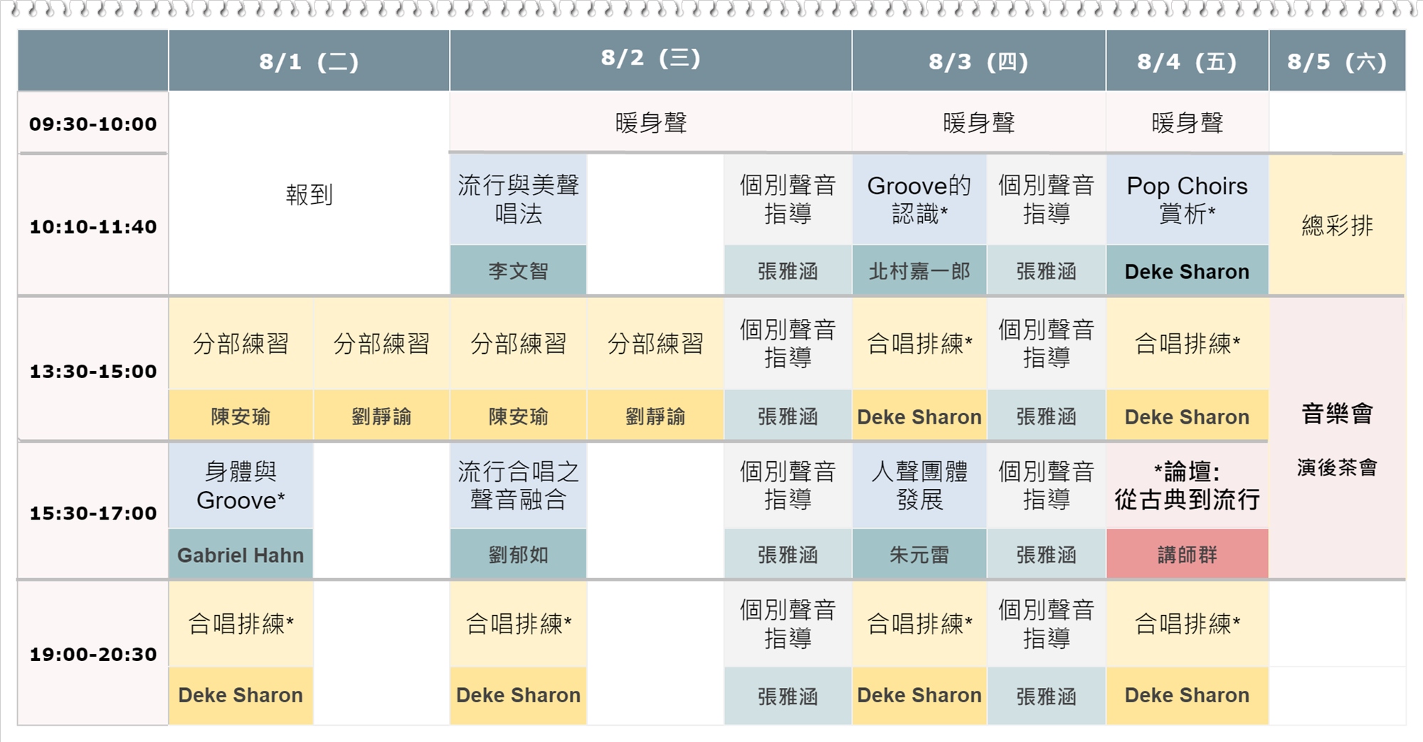置身 Deke Sharon 親自帶領的排練,且看大師如何施展魔法,把合唱和阿卡巧妙的結合在一起。最終將於活動最後一天音樂會中,呈現3~4首曲目。