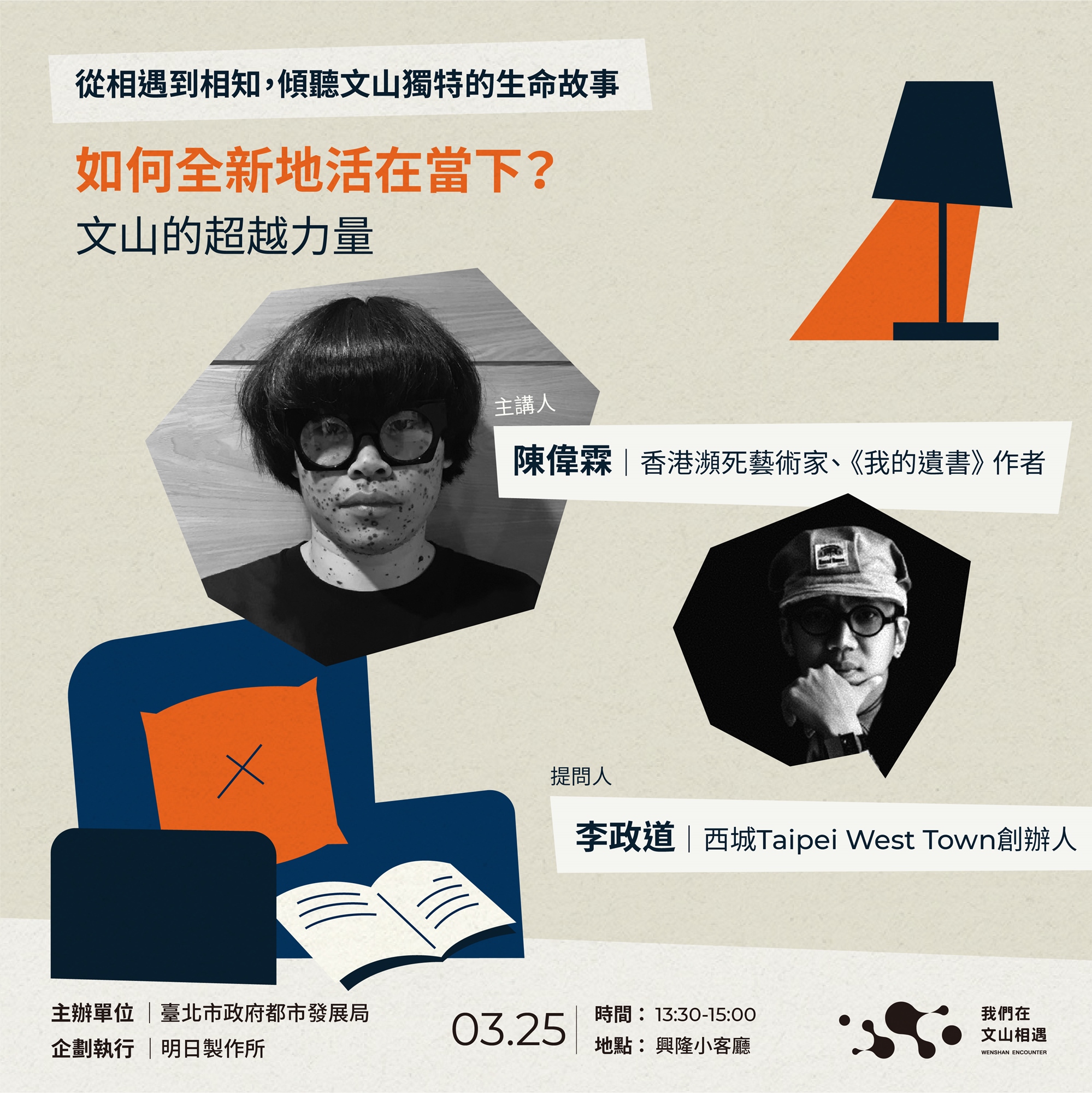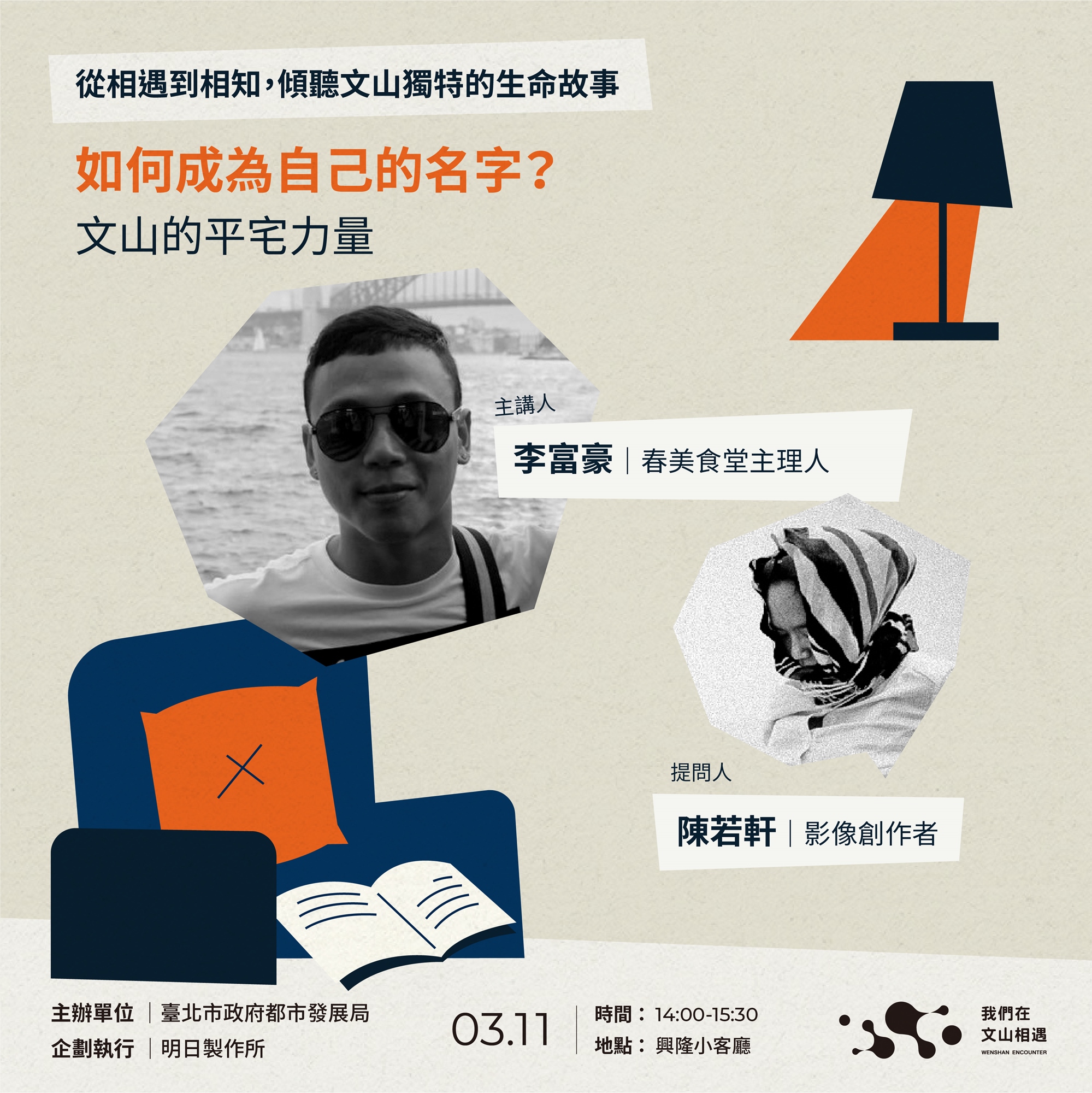 本活動共邀請三位文山在地居民,分別是在安康平宅長大的李富豪、公共藝術交流過程相遇的瀕死藝術家陳偉霖、工作與生活都在文山的洋蔥設計黃家賢,從他們各自獨特的生命經歷中,親自跟我們分享這一路走來的蛻變過程。