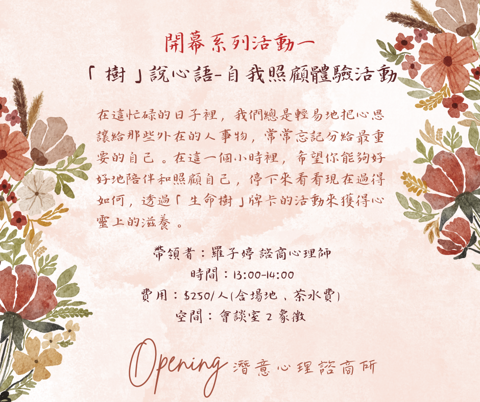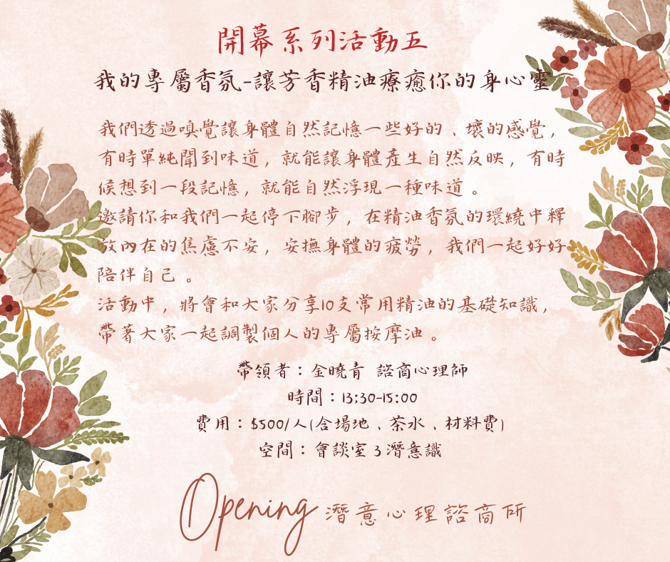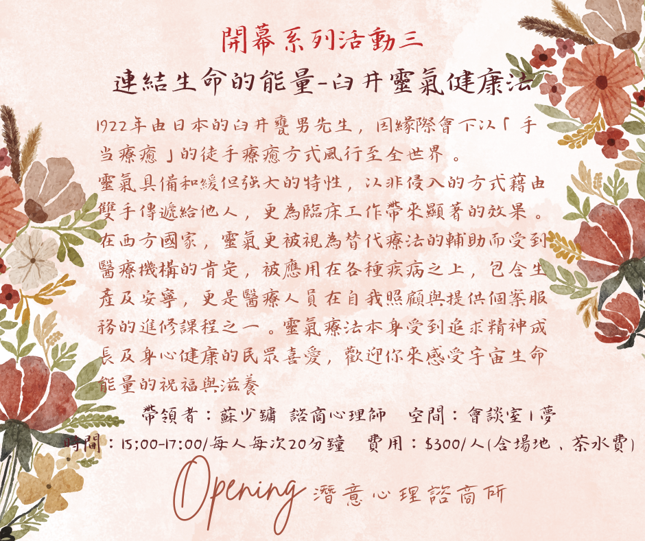 很希望能藉由這次開幕的喜悅,有機會和各位分享我們對 #自我照顧、#心靈探索、#生活適應等等的心得,藉由不同的 #牌卡、#精油、#手作、#夢境、#靈氣、#整理心法 等沉浸式體驗,讓我們跟自己再靠近一點。