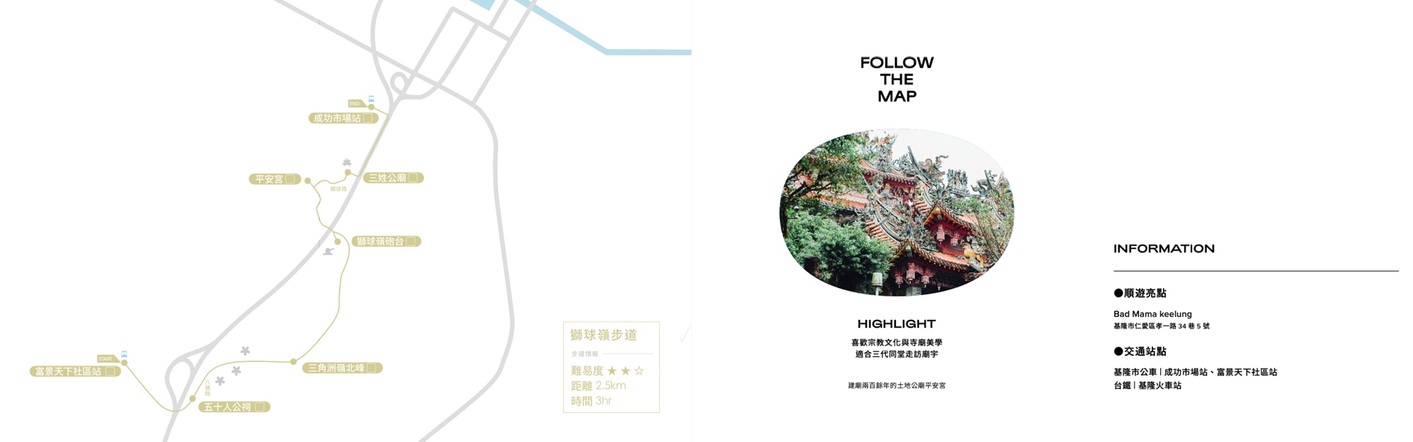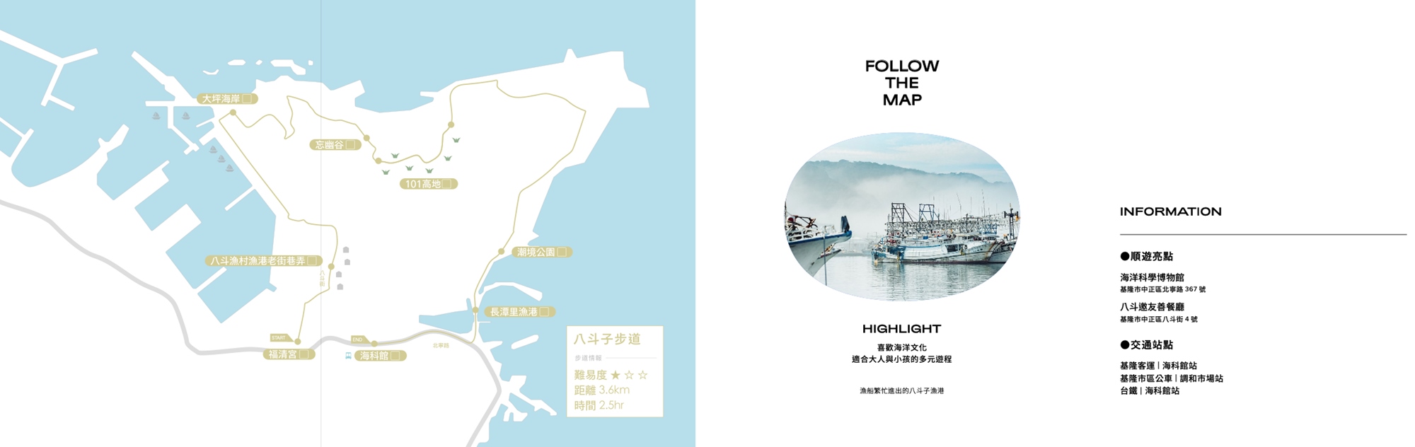 路線特色:環遊一圈八斗子半島,漫步岬灣海岸山稜、潮間帶,眺望孤立在海天中的基隆嶼;或迷行在漁港老聚落,探尋留存在巷弄、古厝和廟宇的地方記憶。走入八斗子的大山大海,聽風聲與潮音吟唱的老漁村故事。