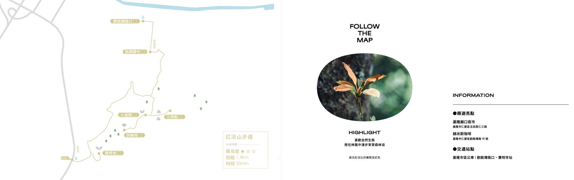 路線特色:基隆人最熟知的步道,除了獅球嶺,莫過於坐落港岸東南方的「紅淡山步道」。紅淡山是一座守護基隆港的保安林,更是基隆都市之肺。放慢腳步,沿途入微觀察山林中充滿蓬勃生機的萬物,與輕海紋白蝶、紅淡比感受台灣生態之美。再登上開闊視野的觀景塔360度環望「五基」,方知基隆不只有雨霧,晴日也有氣勢恢宏的天高地闊。