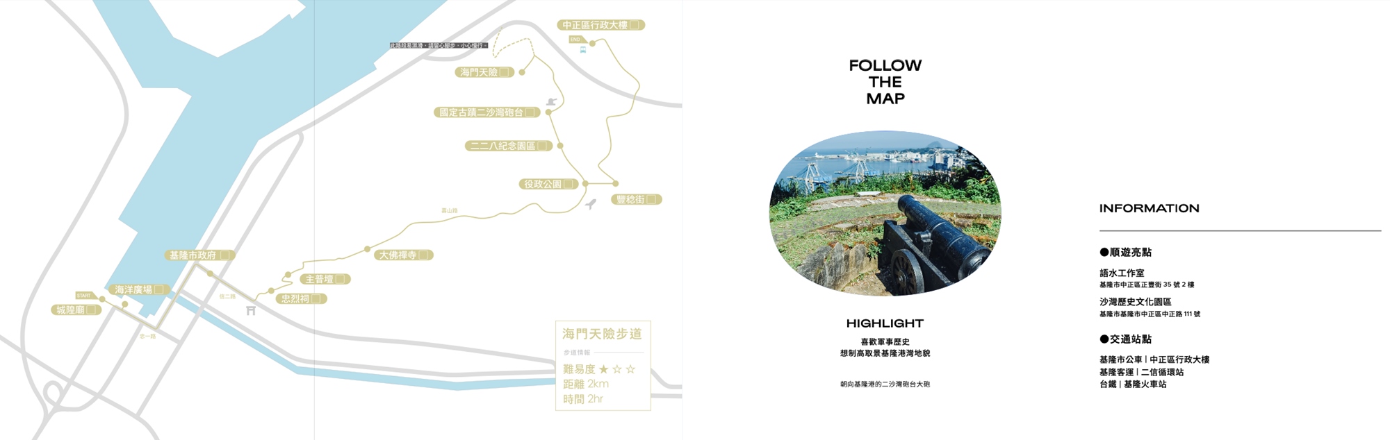 路線特色:從清領、日治至戰後,三個時代不同的城市治理,讓基隆的市街地景幾經更迭。清國與英、法二國交戰之後於基隆所建的軍事設施,日治時期的基隆港築港工事與市街改正,戰後對基隆城市的再詮釋,在基隆文史工作者陳世一的帶路下,從基隆港畔的城隍廟出發,走上港岸邊的山稜至二沙灣砲台及大沙灣砲台遺構,將三個時代所經歷的戰事與城市治理一次看盡。