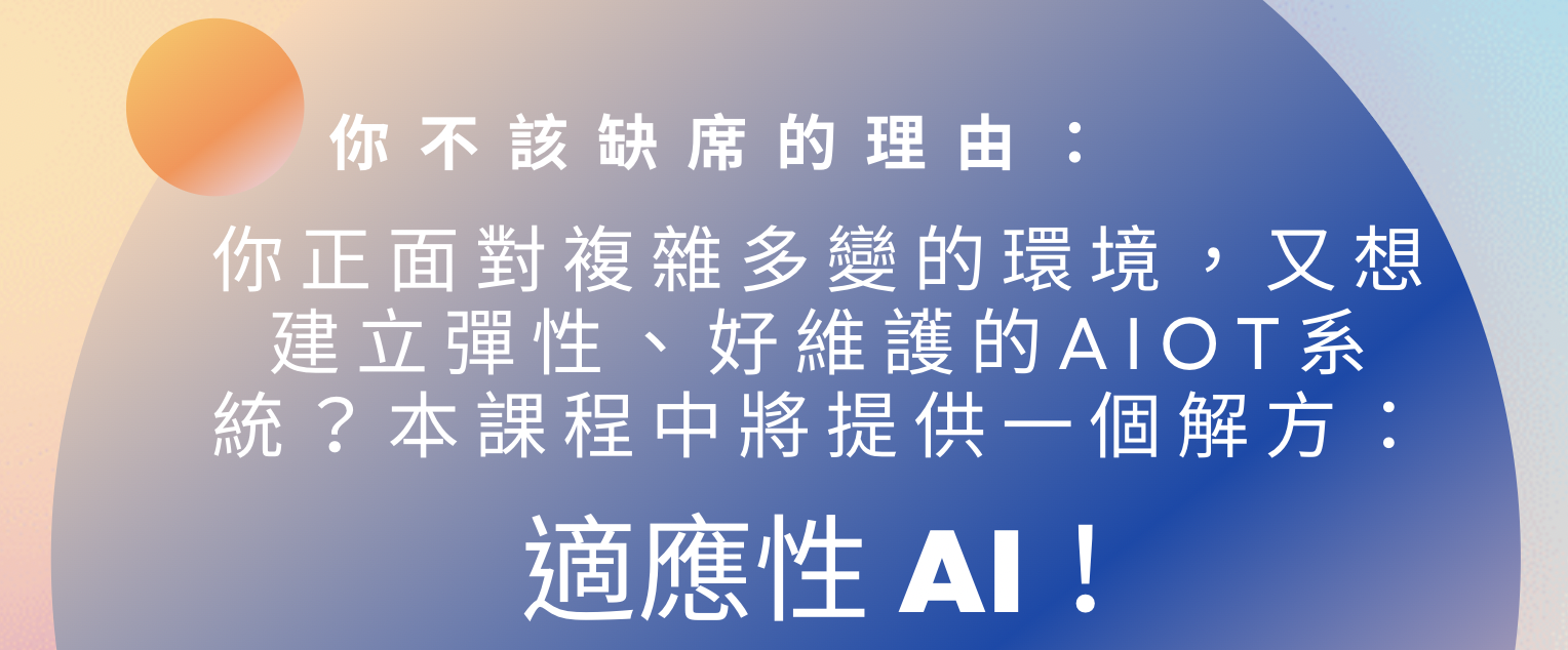 目前 AI 技術已經被廣泛應用,何謂聰明的 AI ?適應性 AI 目前已被指出為 AI 發展的一項重要趨勢,不論是交通、工廠、醫療或零售等各個領域,都必須設置多個終端設備進行協同合作,使得智慧應用的運作環境複雜且多變的特性,Edge AI 工程師將被迫面對資料分佈偏移的問題,必須建立具彈性、好維護的AIoT系統。