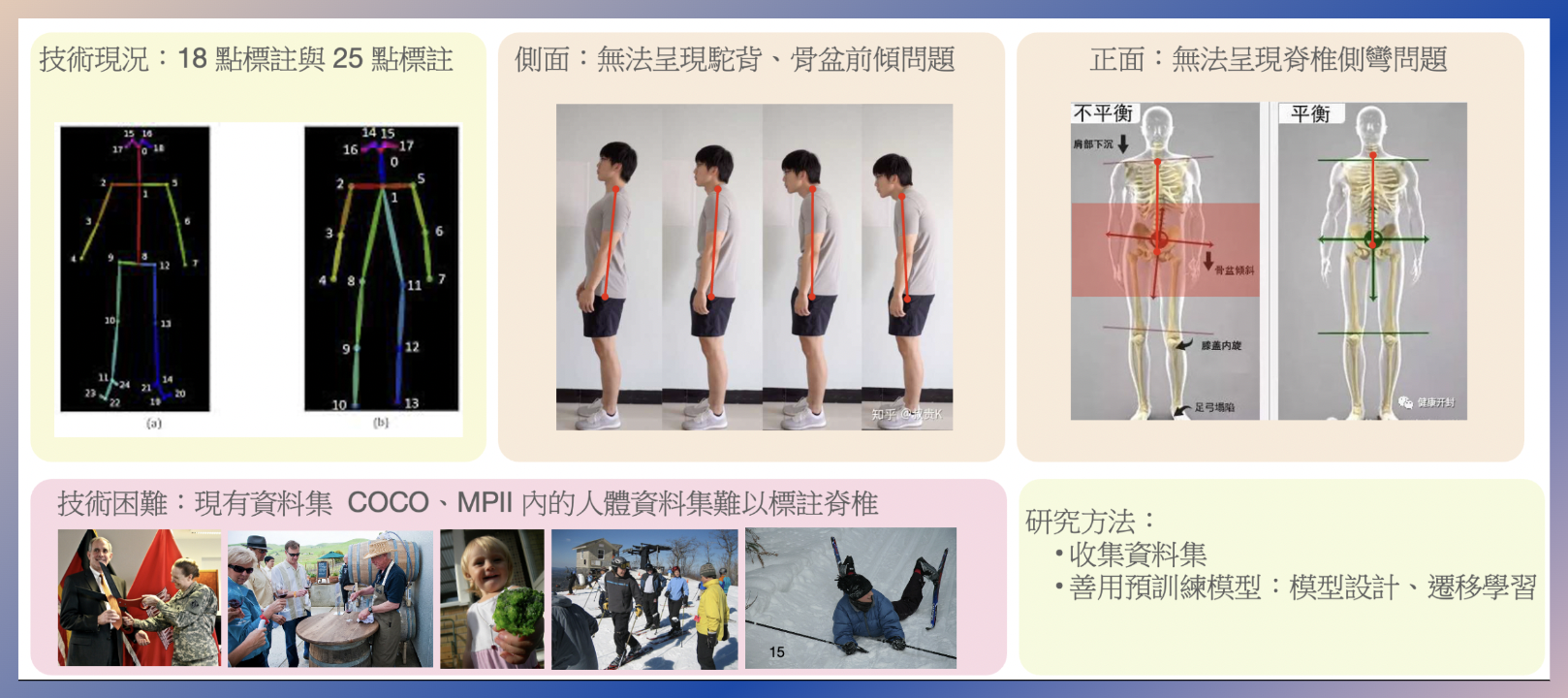實務案例之一將探討「電腦視覺輔助脊椎診斷」這個AI醫療議題的技術挑戰,包括現有資料集難以標注駝背、枕骨前傾、骨盆前傾、脊椎側彎、腰水平等姿態的困難,以及解決之道。