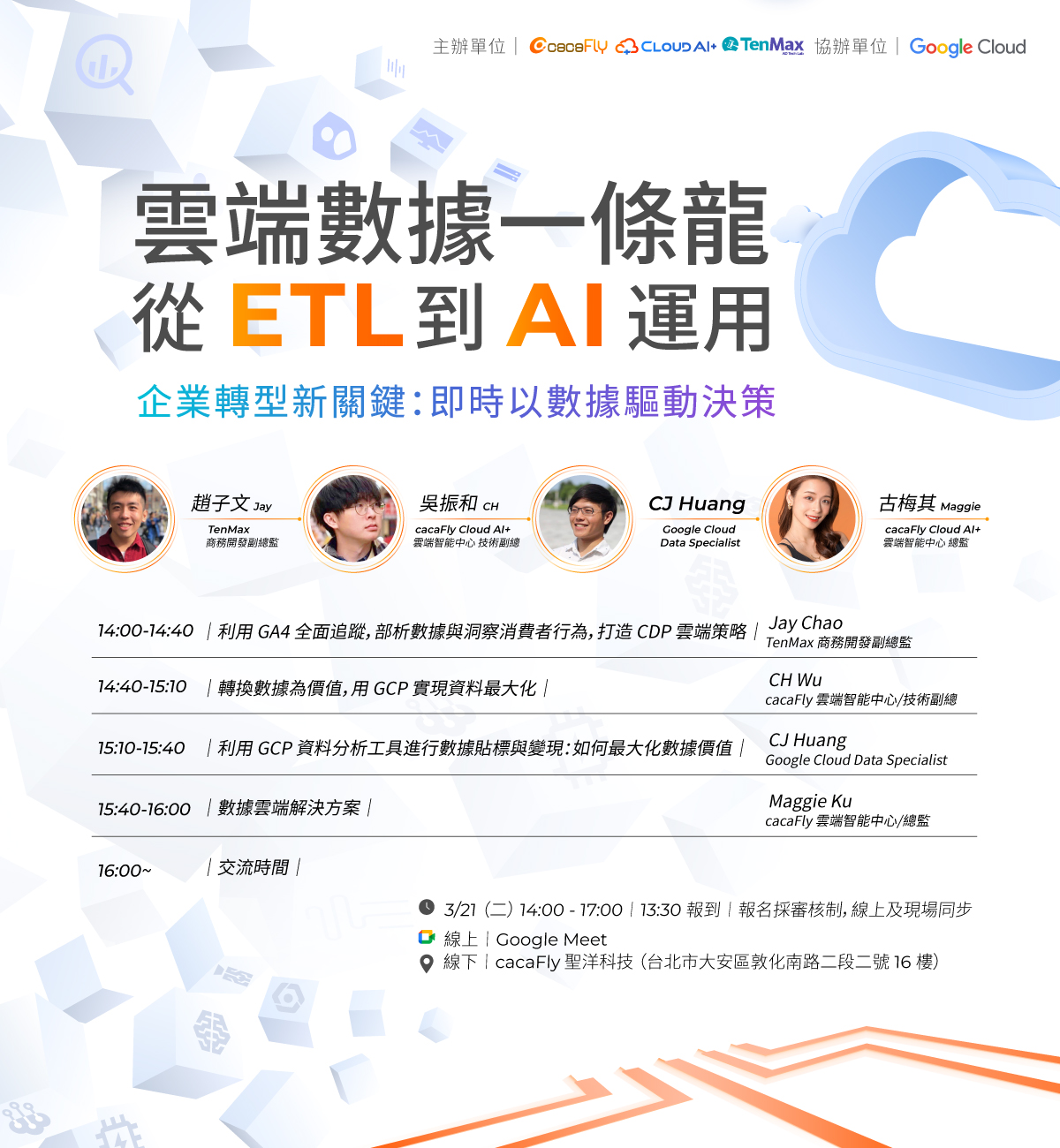 雲端數據處理和分析提供了企業在數據管理和運營上的更多靈活性和效率。在這個講座中,我們將介紹一條龍的雲端數據解決方案,從數據萃取、轉換和載入 (ETL) 到 Google Cloud 的人工智能 (AI) 運用,協助企業最大化數據價值。