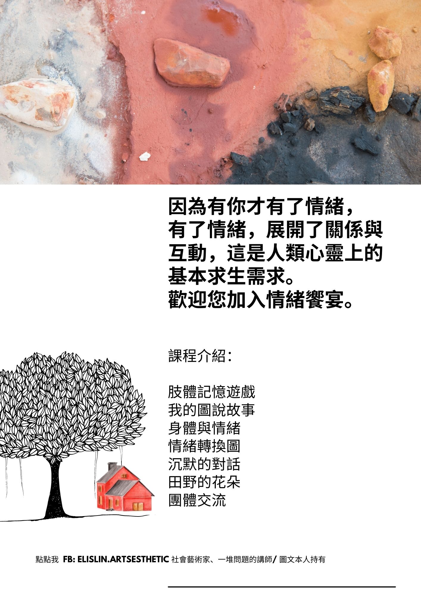 課程介紹:肢體記憶遊戲、我的圖說故事、身體與情緒、情緒轉換圖、沉默的對話、田野的花朵、團體交流。