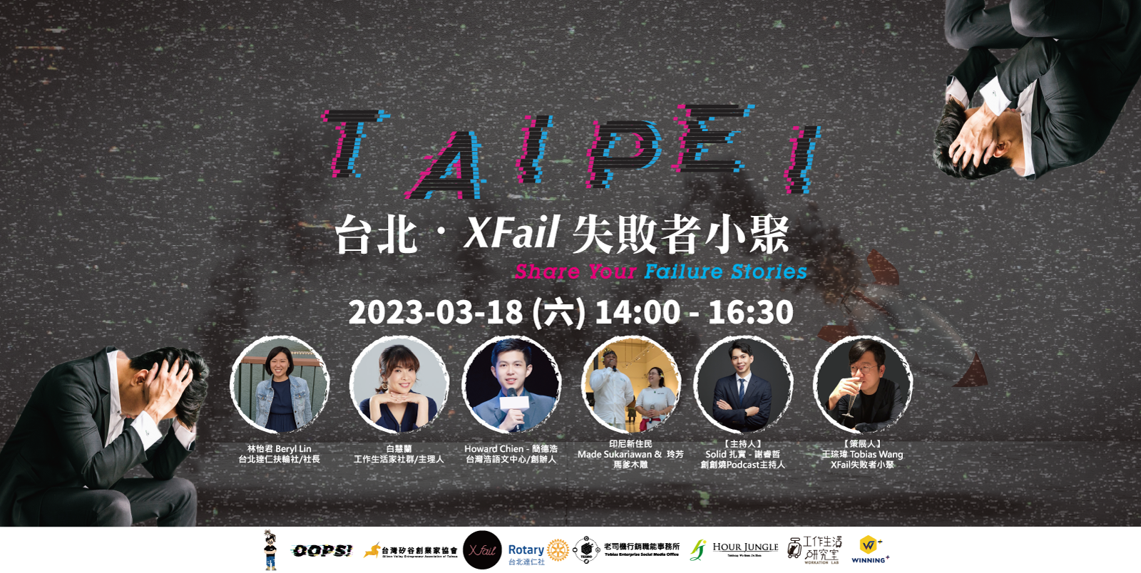 可以是技術研發、開店、新創投資、減肥或前段感情,可以是任何職業領域,任何人名,更可以是無限次、跨領域的失敗經歷。在【XFail 失敗者年會及小聚】勇氣演講人迎擊自己 Fail 經驗,與會者吸收種種珍貴失敗寶典並轉化為避開死亡沼澤的步伐,大步向前。在這地方,你的失敗是別人的成功之母,你的挫敗是更接近成功的一記響鐘,面對失敗,跟它說掰掰,明早起床,又是一個全新世界等著你!