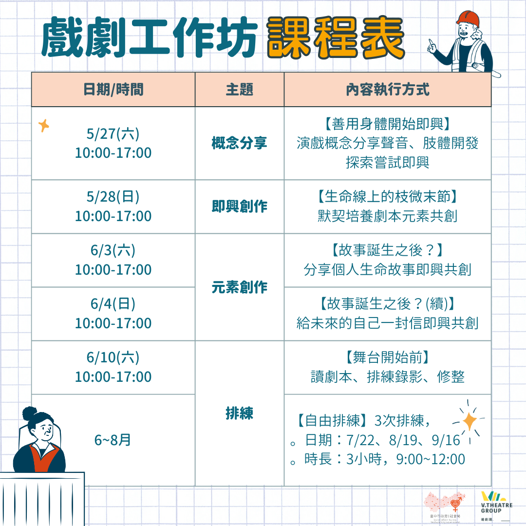 - 課堂中將進行現場攝影,參與本工作坊即同意授權本劇團與社會局進行拍攝、製作及公開展示本工作坊推廣照片及非營利使用。