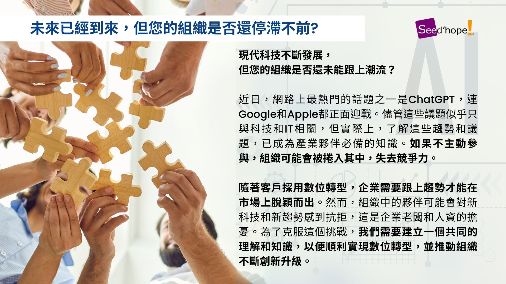 隨著客戶採用數位轉型,企業需要跟上趨勢才能在市場上脫穎而出。然而,組織中的夥伴可能會對新科技和新趨勢感到抗拒,這是企業老闆和人資的擔憂。為了克服這個挑戰,我們需要建立一個共同的理解和知識,以便順利實現數位轉型,並推動組織不斷創新升級。
